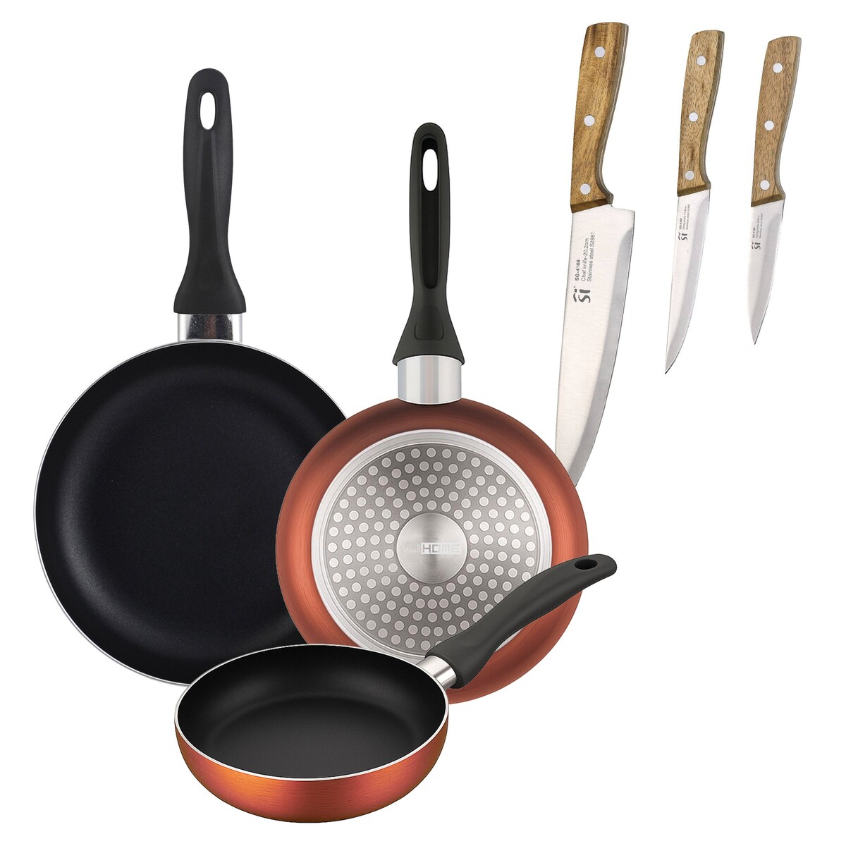 BERGNER - Set aus 3 Pfannen Ø16/20/24cm aus gepresstem Aluminium in metallic-copper mit Set 3 Edelstahlmesser