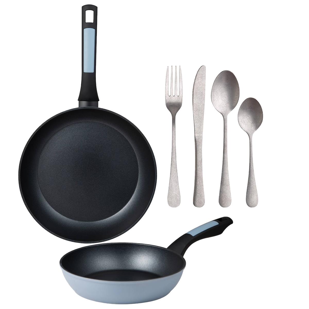 BERGNER - Set aus 2 Pfannen Ø20/26 cm aus gepresstem Aluminium für Induktion geeignet mit Set aus 16 Besteckteilen Edelstahl
