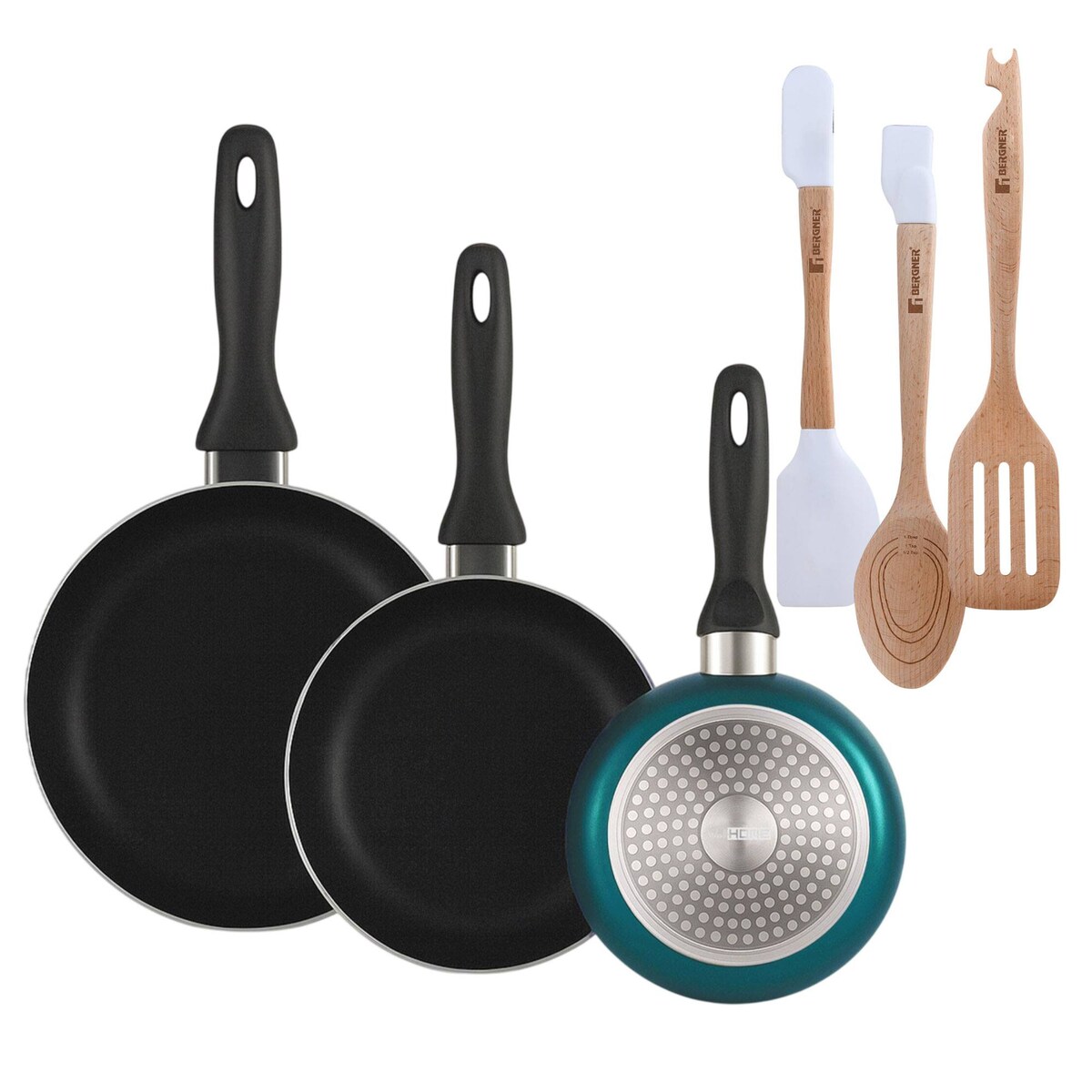 BERGNER - Set aus 3 Pfannen Ø16/20/24cm aus gepresstem Aluminium in metallic-blau mit Set 3 Utensilien aus Silikon und Holz