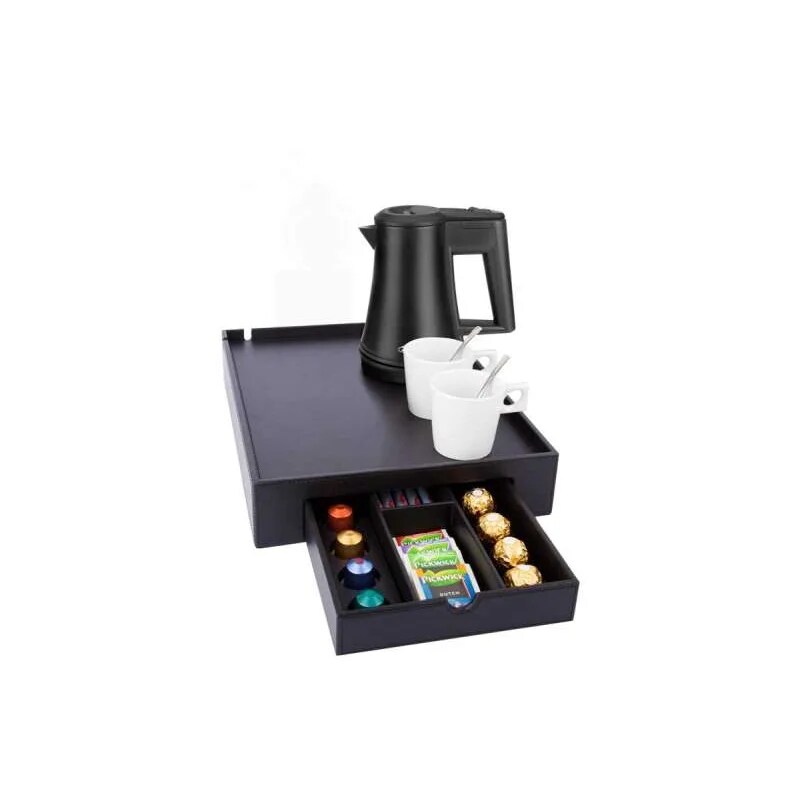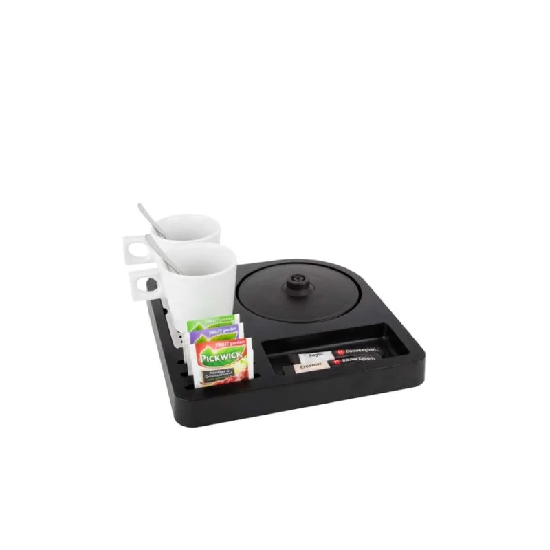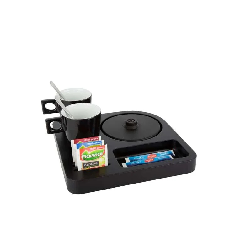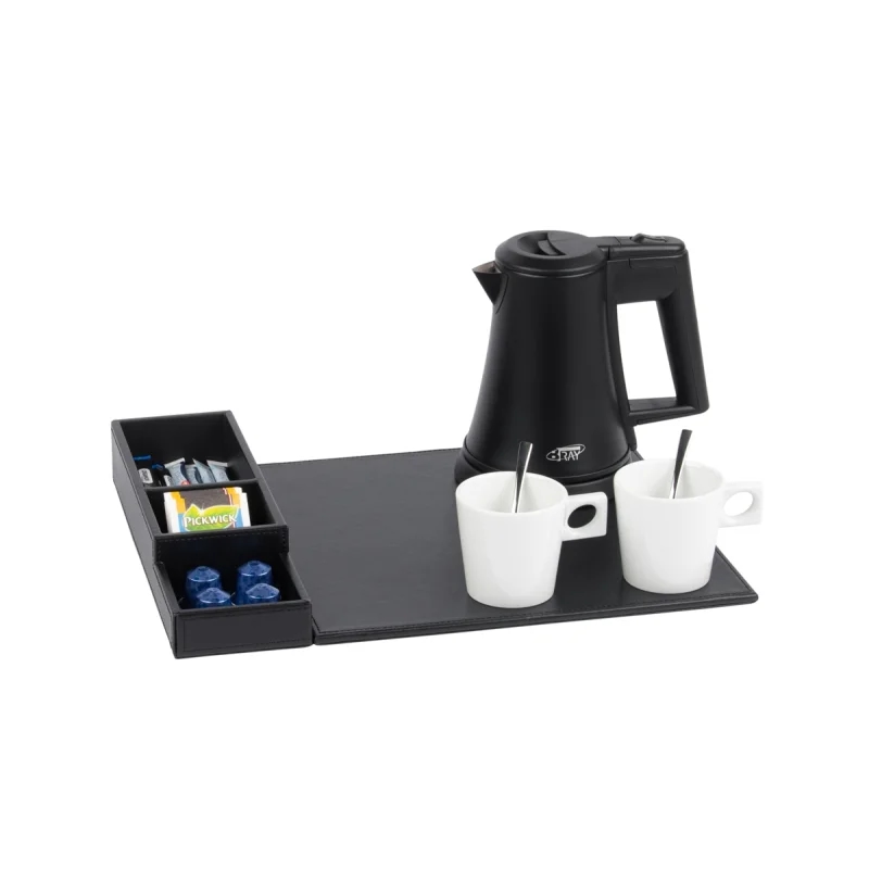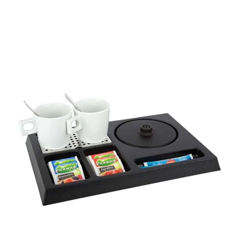 Willkommenstablett SNAP Haupttablett ohne Beilagenbehälter aus Kunstleder Beige mit Wasserkocher STAR 0,5 L Schwarz und 2 schwarzen Porzellantassen