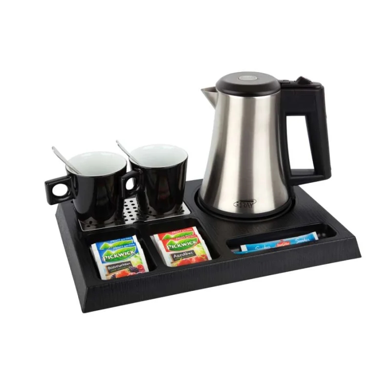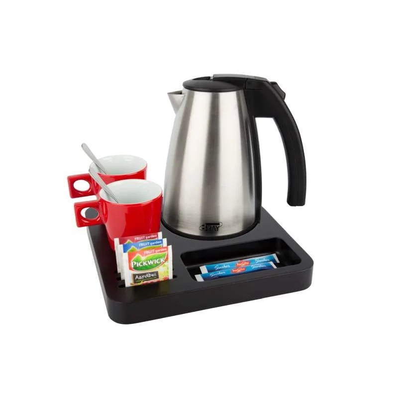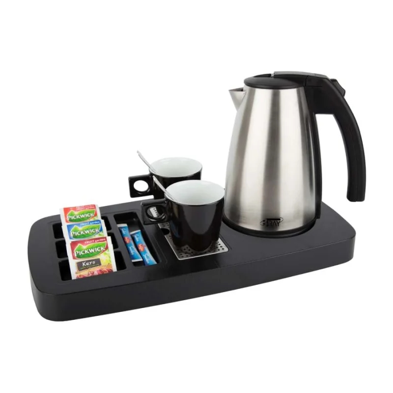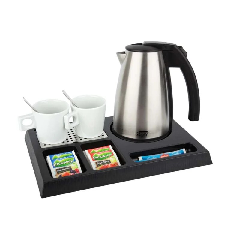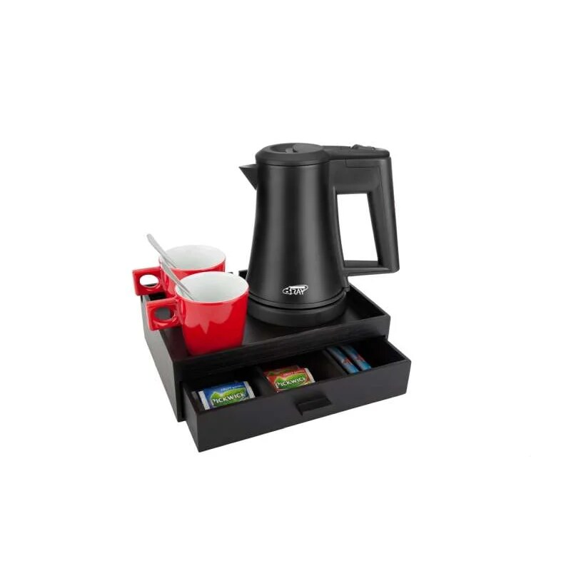 Willkommenstablett STAY Schwarz mit Wasserkocher STAR 0,5 L Edelstahl und 2 schwarze Porzellantassen