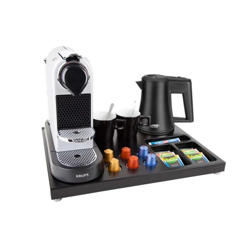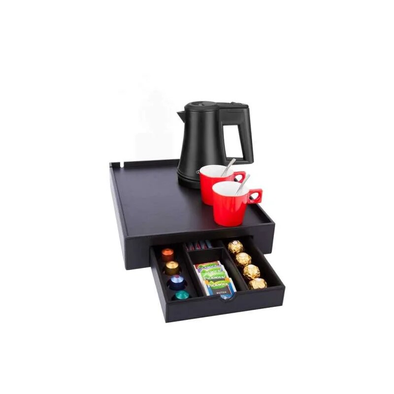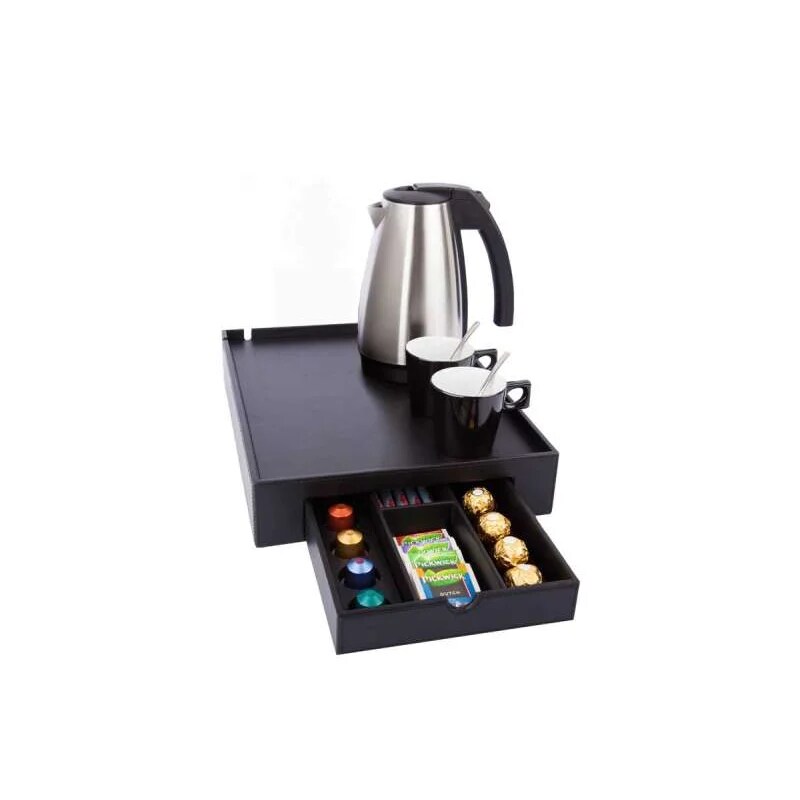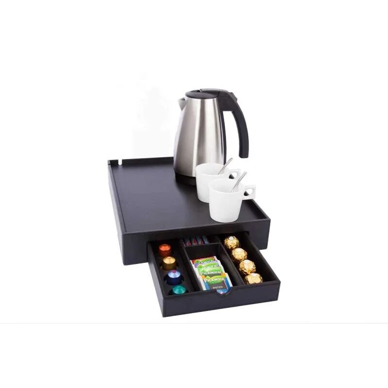 Willkommenstablett SPACE aus Kunstleder Schwarz mit Wasserkocher STYLE 1,0 L, 2 schwarzen Porzellantassen und Kaffeemaschine START