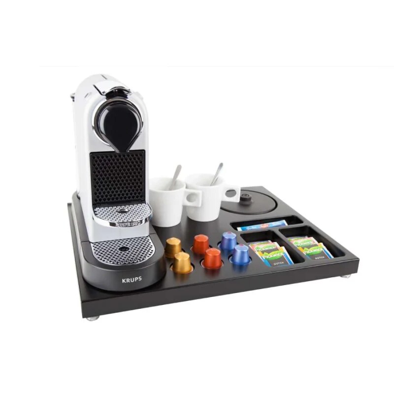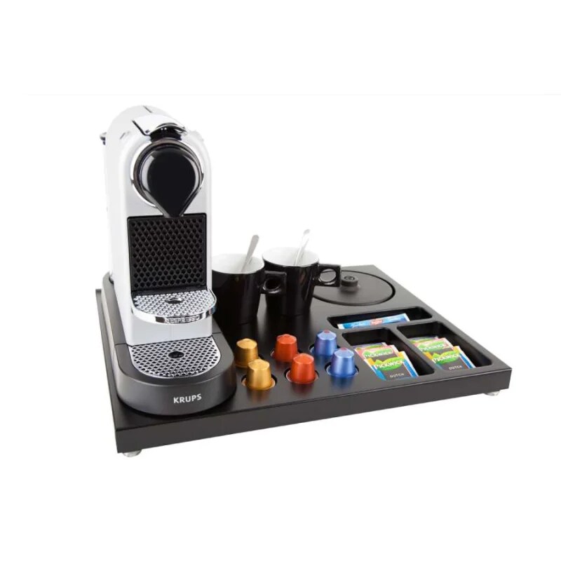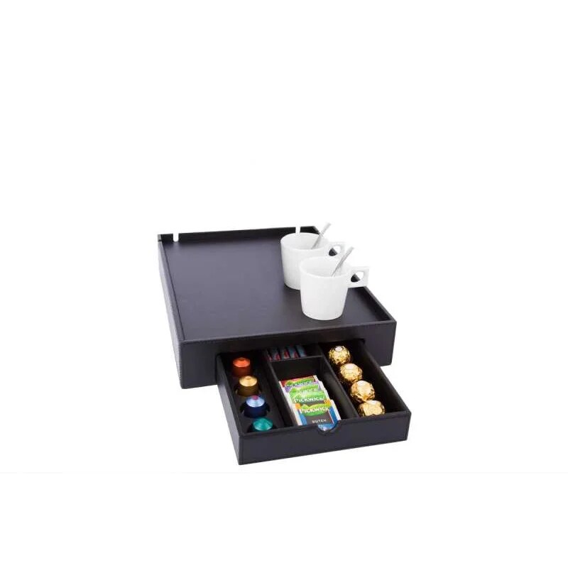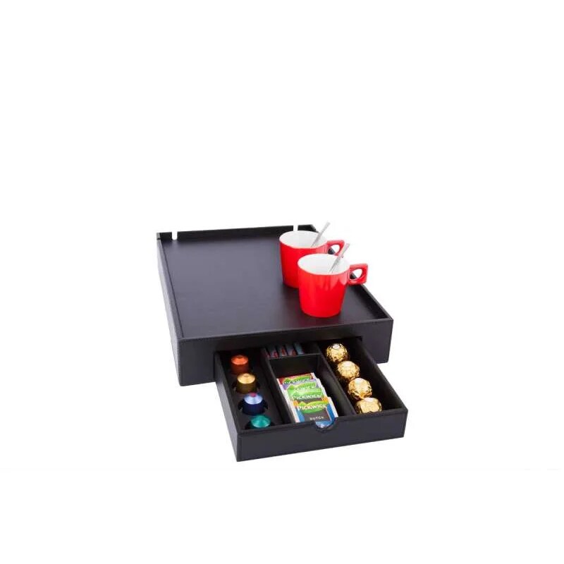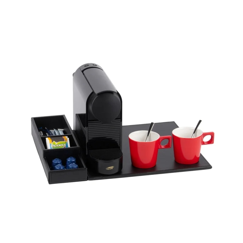 Willkommenstablett SPACE aus Kunstleder Schwarz mit 2 schwarzen Porzellantassen und Kaffeemaschine START