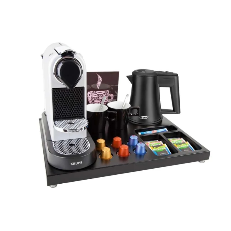 Willkommenstablett SPACE aus Kunstleder Beige mit Wasserkocher STAR 0,5 L Edelstahl, 2 schwarzen Porzellantassen und Kaffeemaschine START
