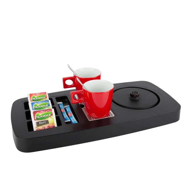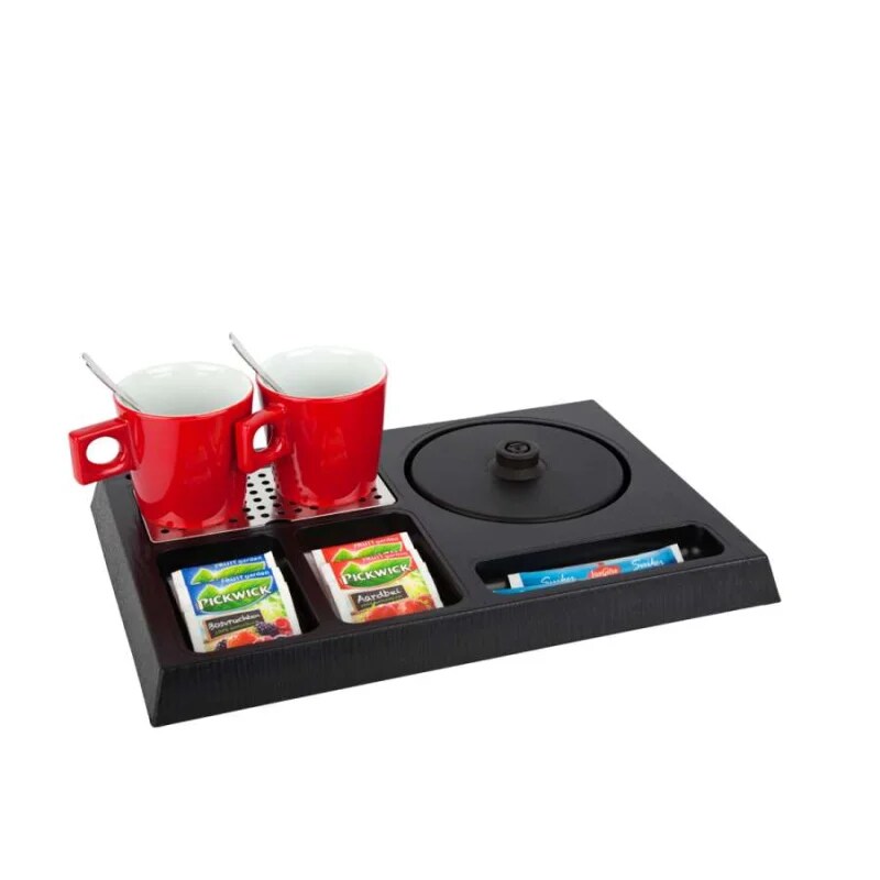Willkommenstablett SUPREME Schwarz-Braun mit Wasserkocher STAR 0,5 L Schwarz und 2 rote Porzellantassen mit A5 Prospekthalter