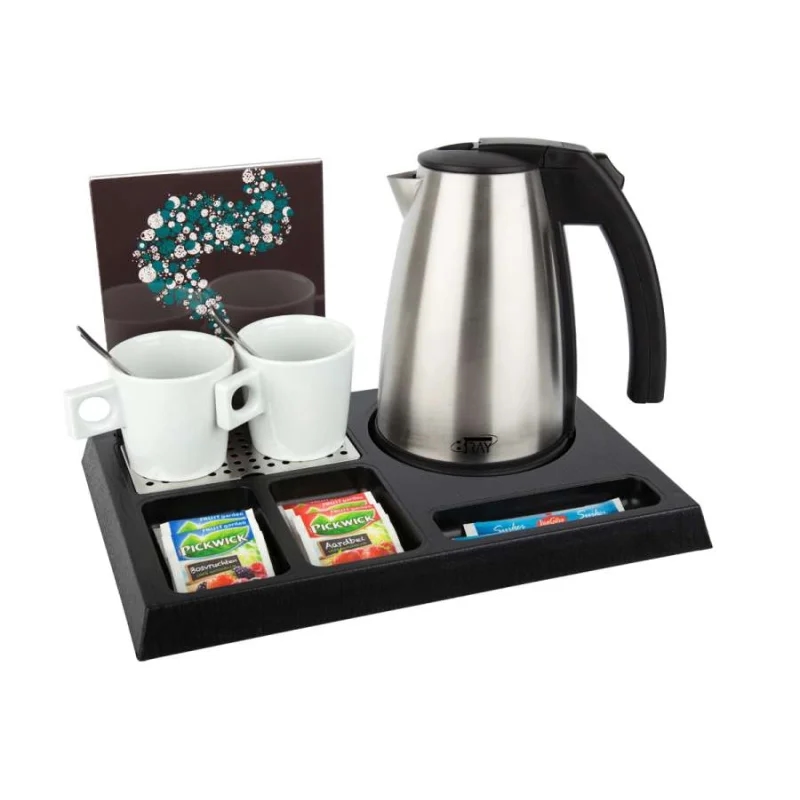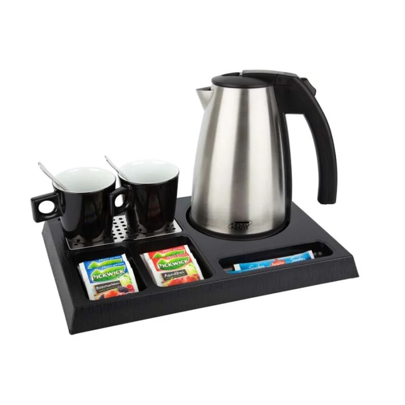 Willkommenstablett SMART Dunkelbraun mit Wasserkocher STAR 0,5 L Edelstahl und 2 schwarze Porzellantassen