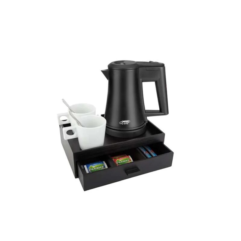Willkommenstablett SMART Dunkelbraun mit Wasserkocher STAR 0,5 L Schwarz und 2 weiße Porzellantassen