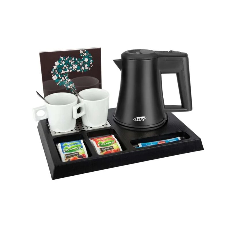 Willkommenstablett STAY Schwarz mit Wasserkocher STAR 0,5 L Schwarz und 2 weiße Porzellantassen mit A5 Prospekthalter
