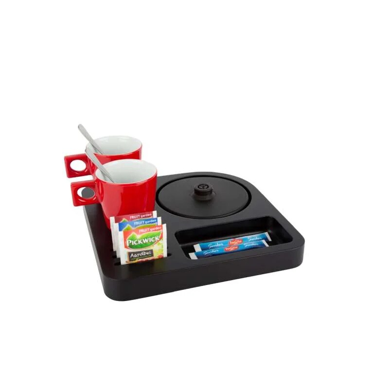 Willkommenstablett SNAP Haupttablett ohne Beilagenbehälter aus Kunstleder Beige mit Wasserkocher STAR 0,5 L Schwarz und 2 roten Porzellantassen
