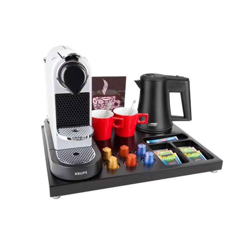 Willkommenstablett SPACE aus Kunstleder Beige mit Wasserkocher STAR 0,5 L Schwarz, 2 roten Porzellantassen und Kaffeemaschine START