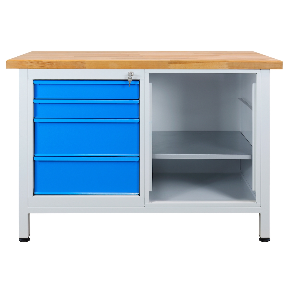 PROREGAL Werkbank Rhino mit 4 Schubladen + Regalteil | HxBxT 84x120x60cm | Traglast 300kg | Lichtgrau/Lichtblau