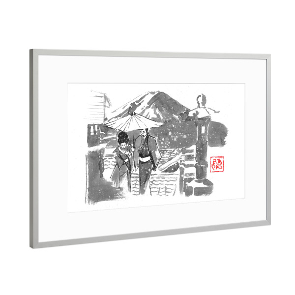 Poster mit Rahmen Silber "Spaziergang unter dem Schnee" artboxONE - Schwarzweiß,Reise / Asien - Fuji,Japan,Regenschirm,Sumie,Samurai,Geisha