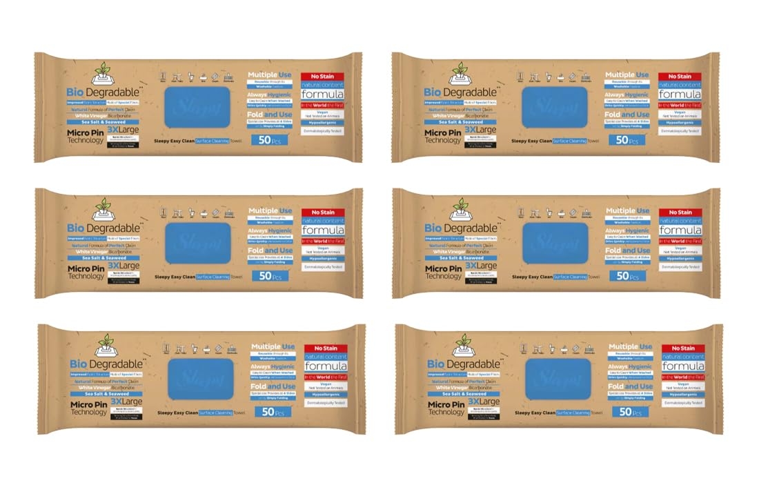 Sleepy Easy Clean Bio Oberflächen und Boden Reinigungstücher 2 in 1 (Blau) mit Meersalz & Meeresalgen - 6 Packung x 50 Tücher
