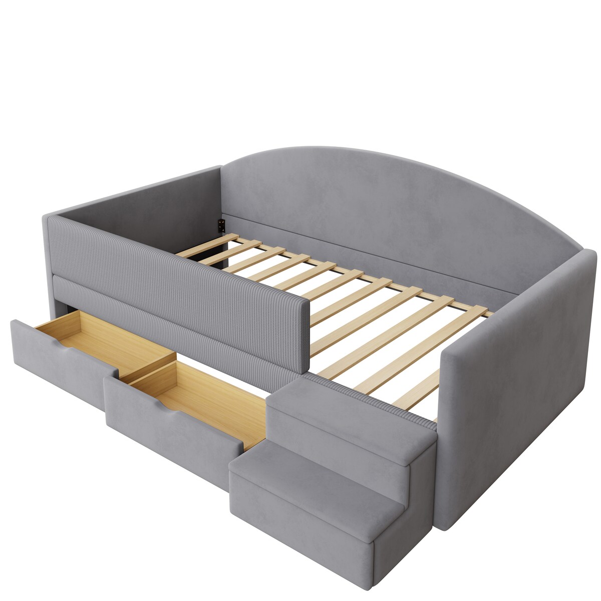 OKWISH Polsterbett 90x190 mit Stauraum und zwei Schubladen, modernes Einzelbett mit Schutzgeländer, weicher Samt, Hellgrau