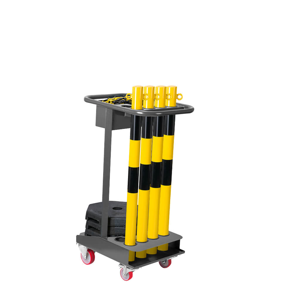 ROBUSTO Kettenpfostenwagen mit 4er Absperrpfosten-Set gelb/schwarz, Stahl, Kettenpoller, Sperrpfosten, Absperrkette