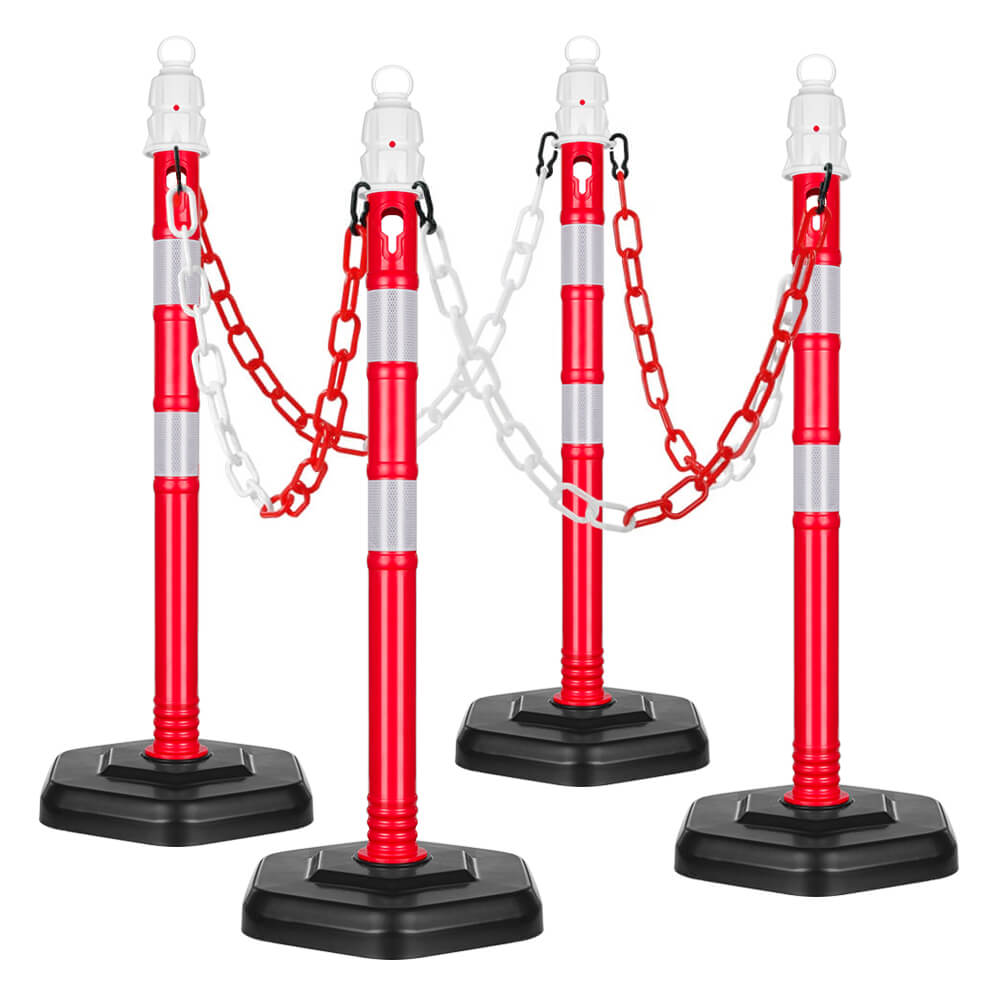 UISEBRT 4 Stück Flexible Absperrpfosten Kunststoff 82x28x28 cm Kettenpfosten Sperrpfosten mit 4 Kette von 1,4 m und Standfuß Weiß/Rot Pfosten