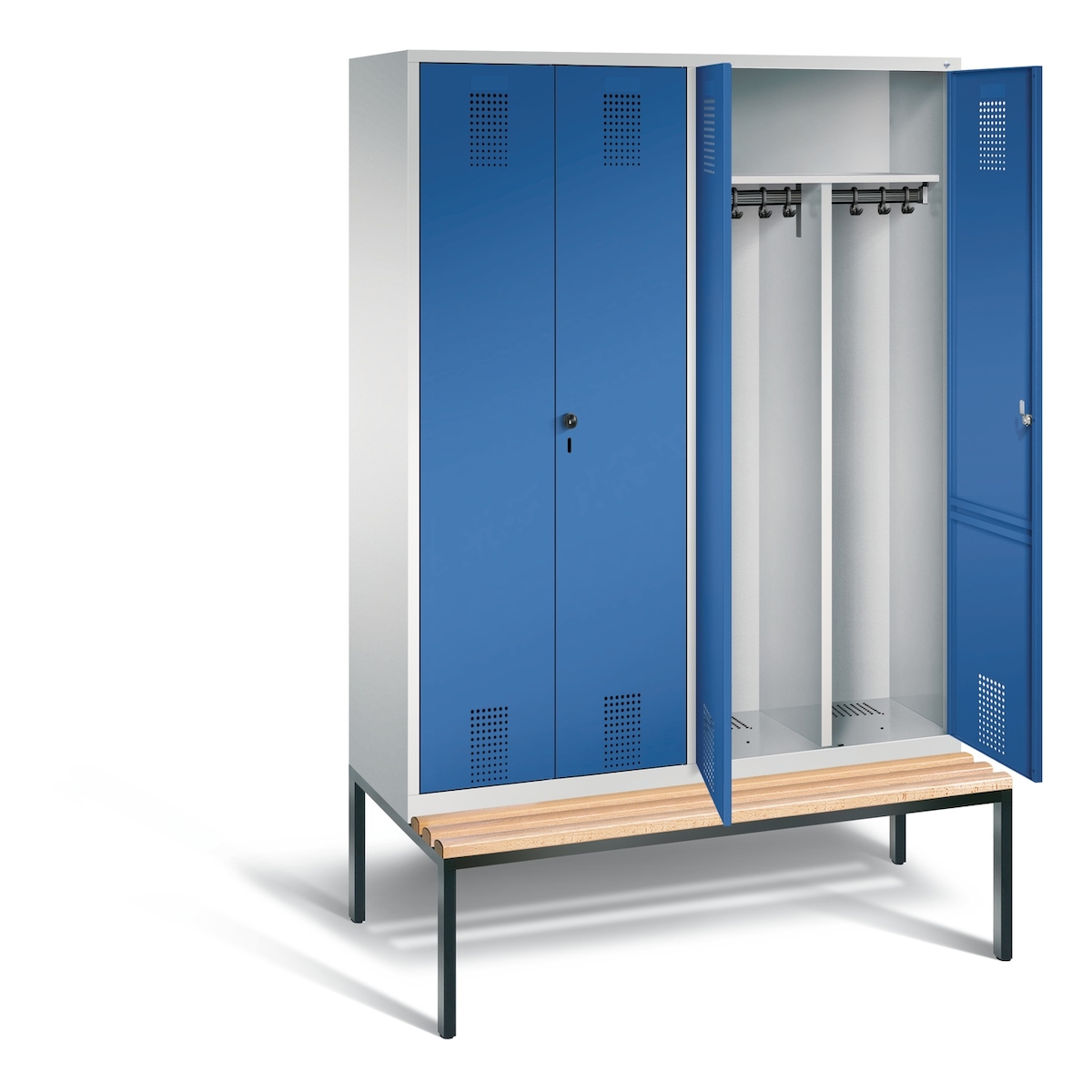 C+P Spind Classic PLUS, Bank, 2 Abteile, 2120x600x815mm, 7035/5010 Verschluss Sicherheits-Drehriegel 4 Garderobenhaken Trennwand mittig Dekor Banklatt
