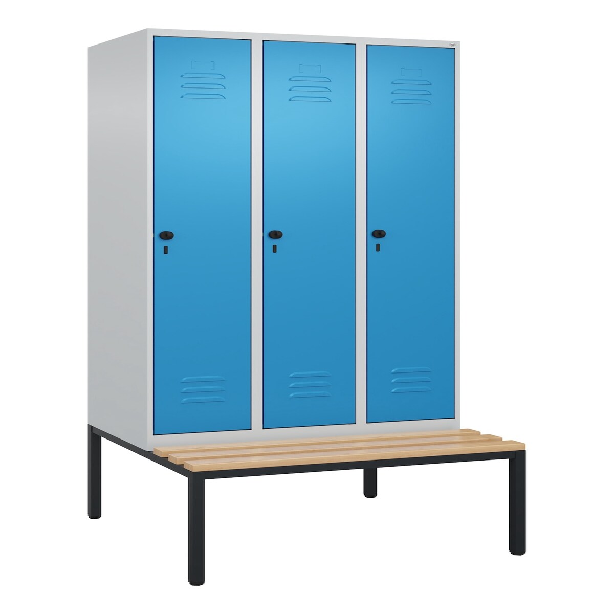 C+P Spind Classic PLUS, Buche untergebaute Sitzbank 3 Abteile, HxBxT 212x90x82cm, Sicherheitsdrehriegel, Hellgrau/Lichtblau von PROREGAL