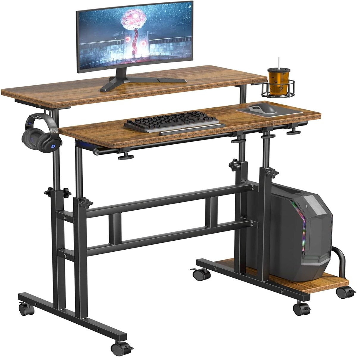 Laptoptisch mit Rollen, höhenverstellbarer 69-90cm,Schreibtisch Computertisch Mobiler Stehtisch Überbett-Tisch,Beistelltisch für Sofa Braun