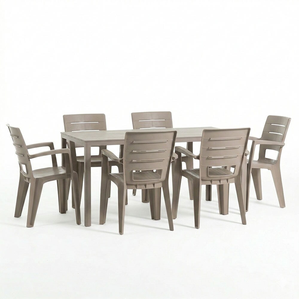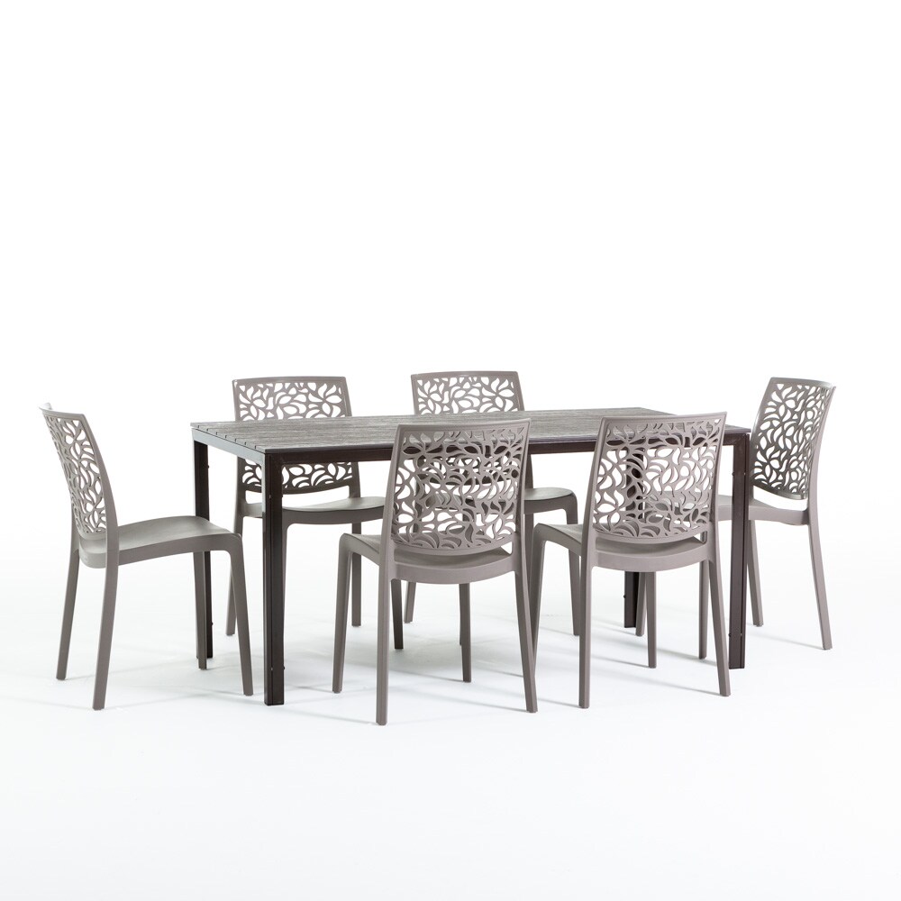 RATTATAN Gartenset mit Tisch und 6 Stühlen, rechteckiger Tisch mit Eisenstruktur und einteilige, stapelbare Stühle aus Harz – Thomas+Anna/Taupe-Mokka
