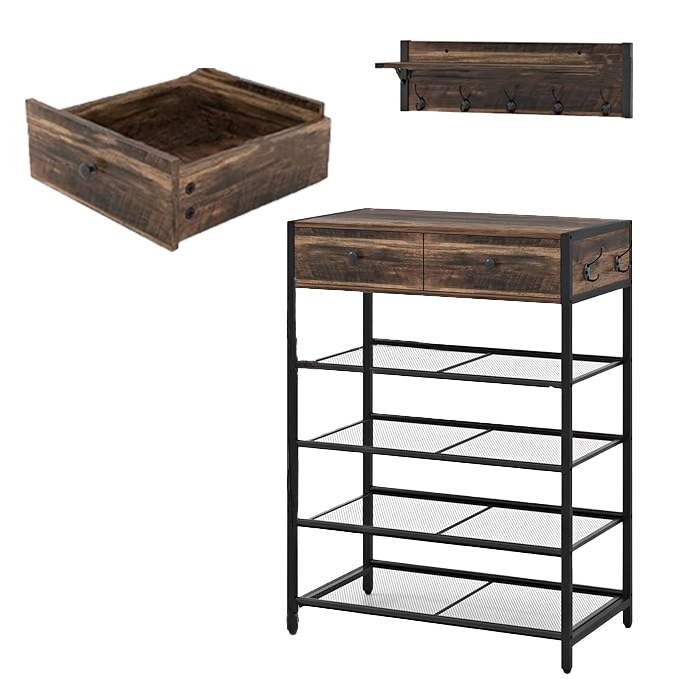 COSTWAY Wandgarderobe mit Schuhregal, mit Ablage und 5 Haken, Schuhregal mit 4 Gitterablagen, 2 Schubladen und 2 seitlichen Haken, braun
