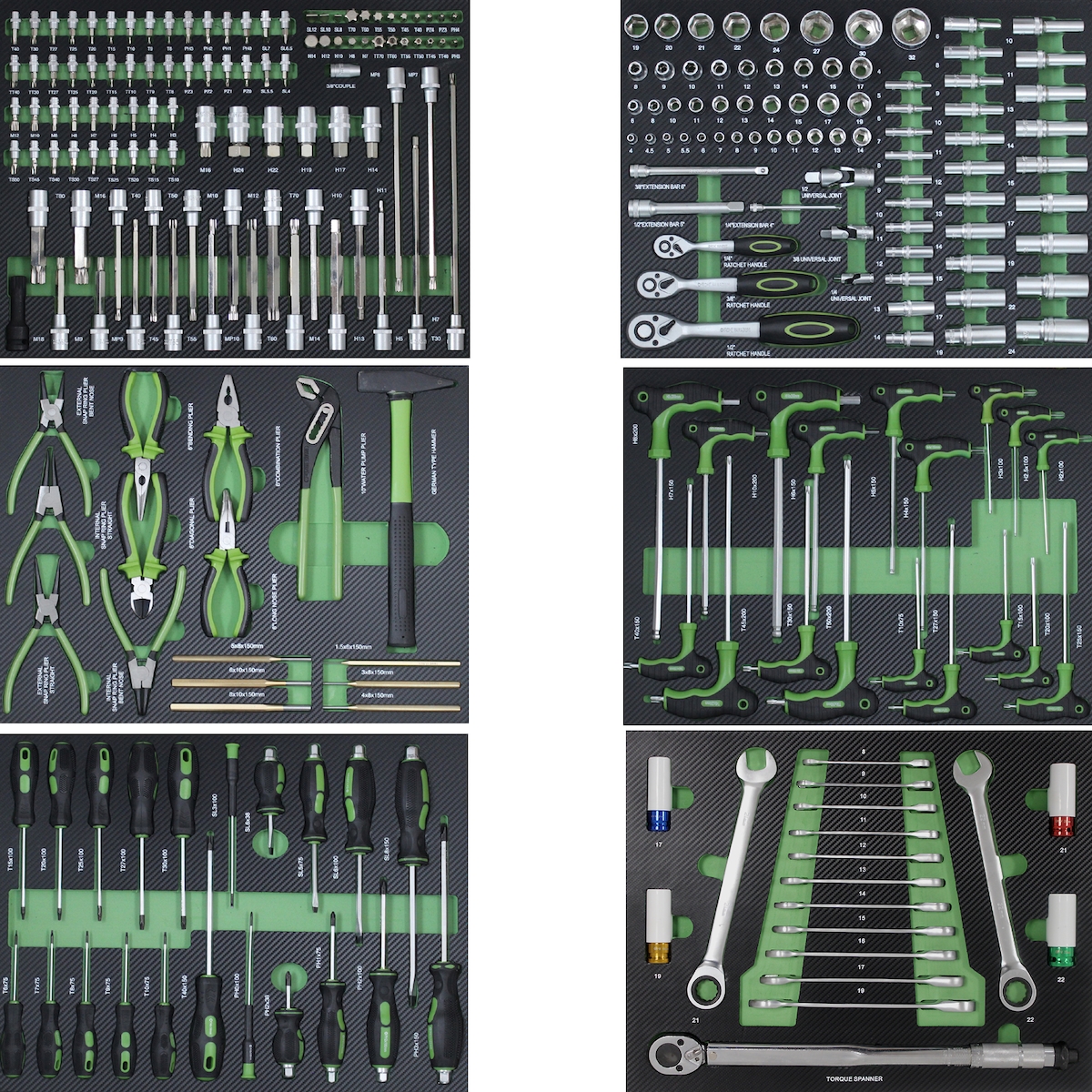 Baumarktplus 6 x Werkstattwageneinlagen 520 x 400 mm bestückt mit 254 Teilen Chrom-Vanadium Werkzeug grün