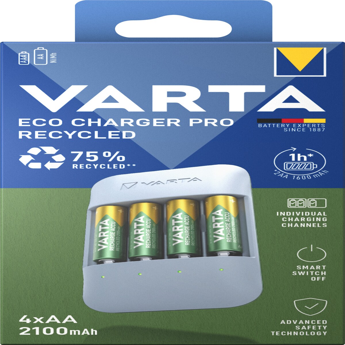 Varta Akku NiMH, Universal Ladegerät, Eco Charger Pro Recycled, inkl. Akkus, 4x Mignon, AA, 2100mAh, Retail