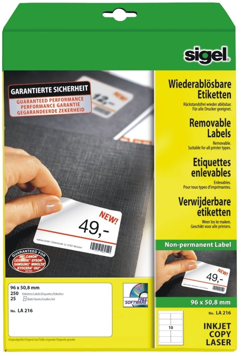 Sigel Etiketten Inkjet/Laser Kopier 96x50,8mm ablösbar VE=10x250 Stück (25 Blatt) weiß