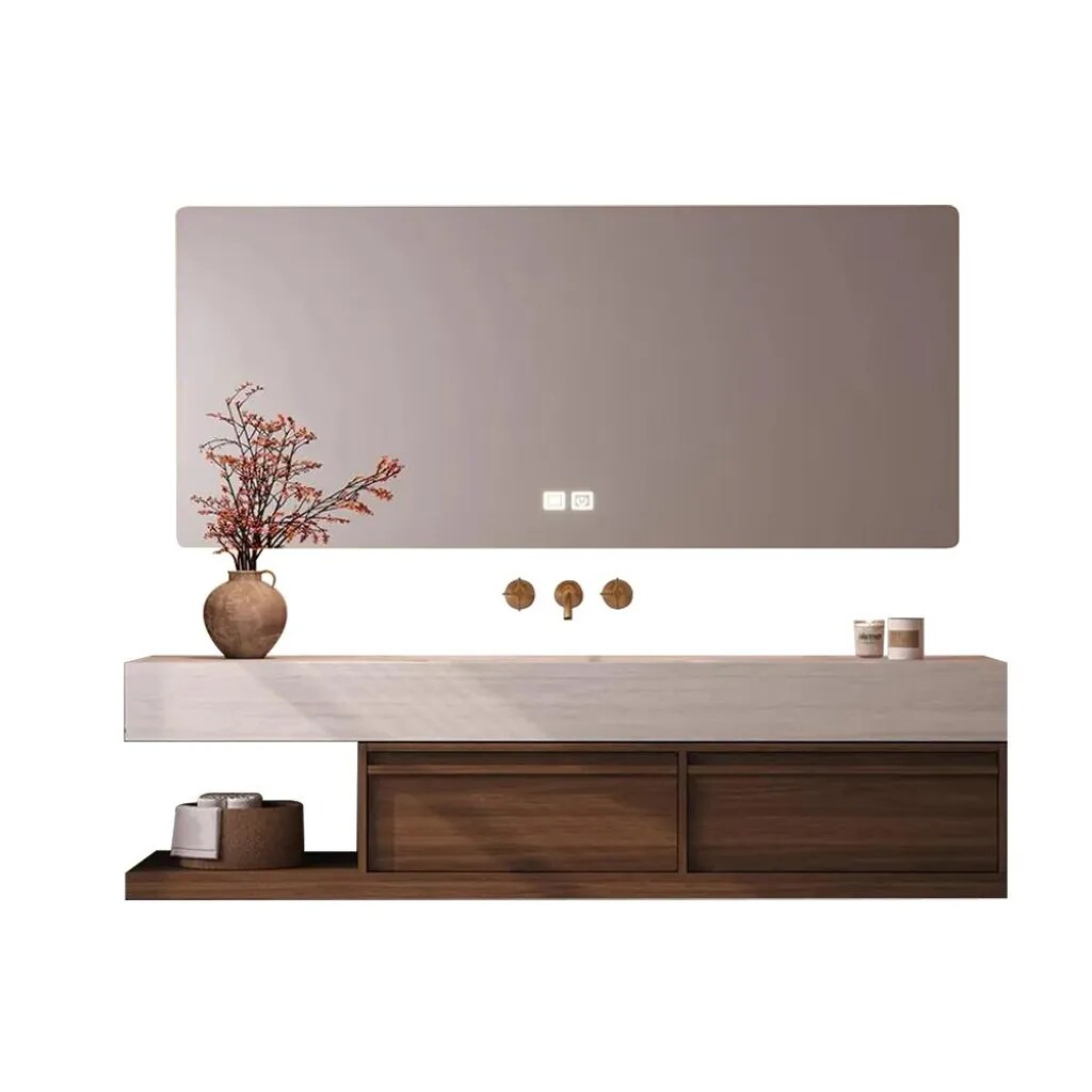 Wandhängendes Badmöbel-Set Travertin-Look mit Sinterstein Waschbecken Spiegel Unterschrank Ablage ohne Armaturloch 140×55 cm【RW016-140 BKK】
