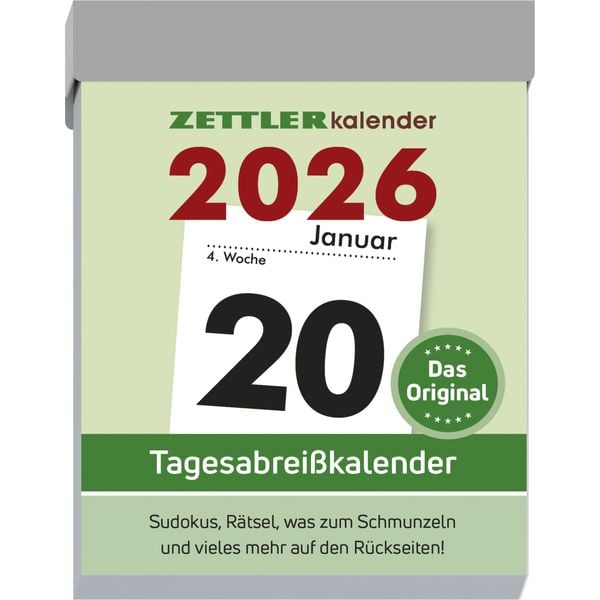 Zettler Tagesabreißkalender M 2026 - Abreißkalender 5 × 7 cm, 1 Tag pro Seite mit Sudoku, Sprüchen, Rätseln & Rezepten auf den Rückseiten,