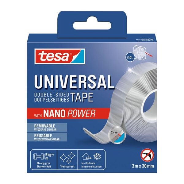 TESA Doppelseitiges Klebeband universal Nano Power auf Abroller, 30 mm x 3 m mit Abroller