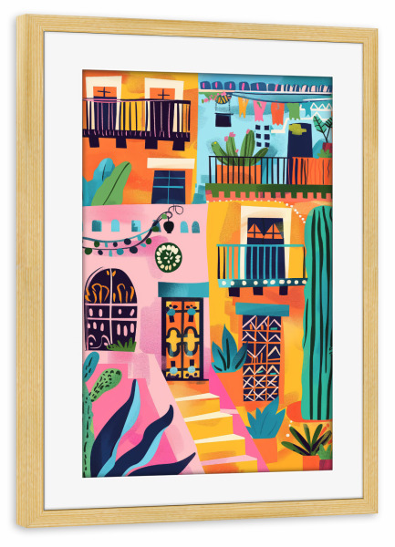 Poster mit Rahmen kiefer "Bunte urbane Oase" artboxONE - Natur,Reise,Architektur - Bunte kunst,Illustration,Tropisch,Kaktus,Abstrakt,Gebäude
