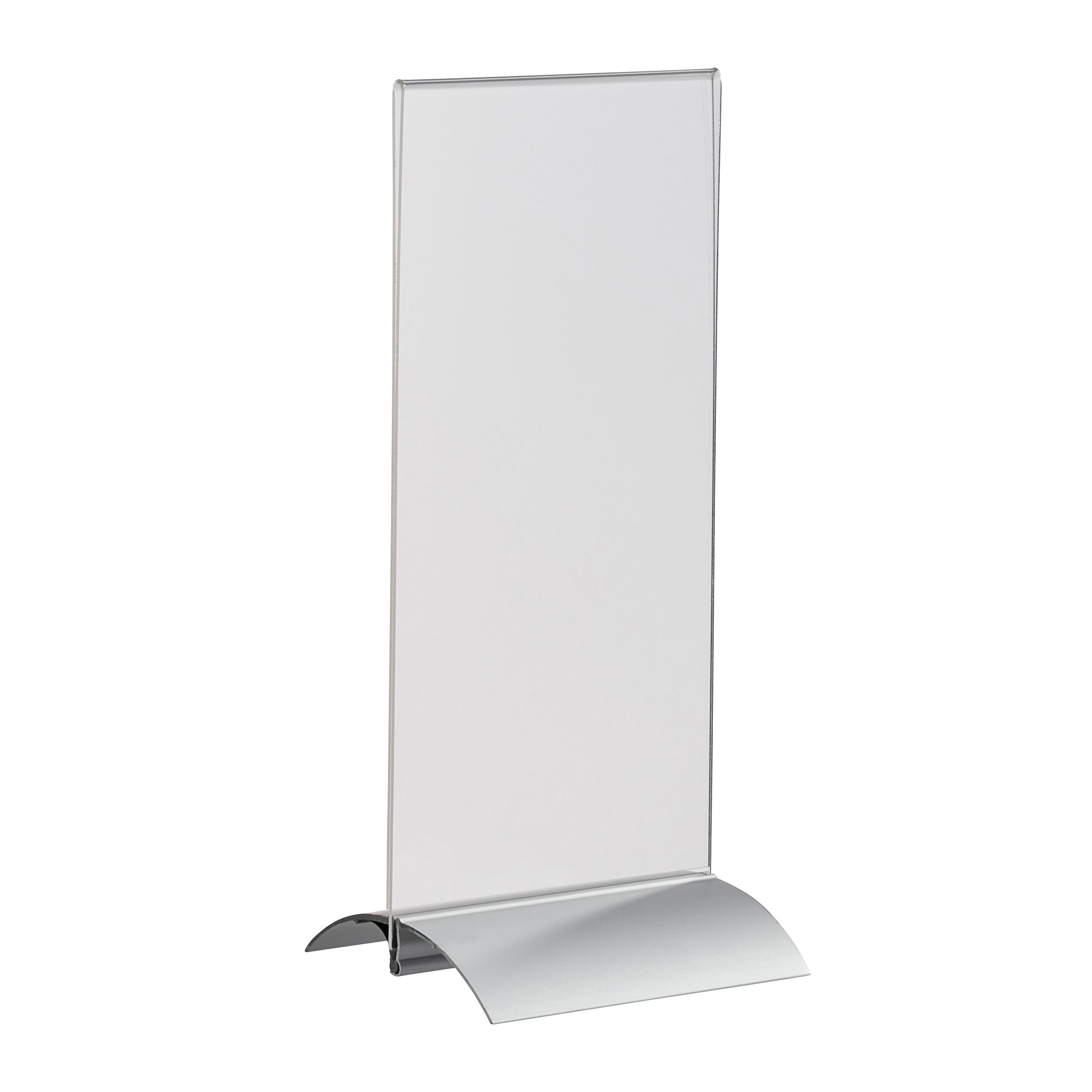 T-Aufsteller mit Aluminumklemmfuß 1/3 A4 | Hochformat, Acryl (PMMA)|Aluminium, silber|transparent