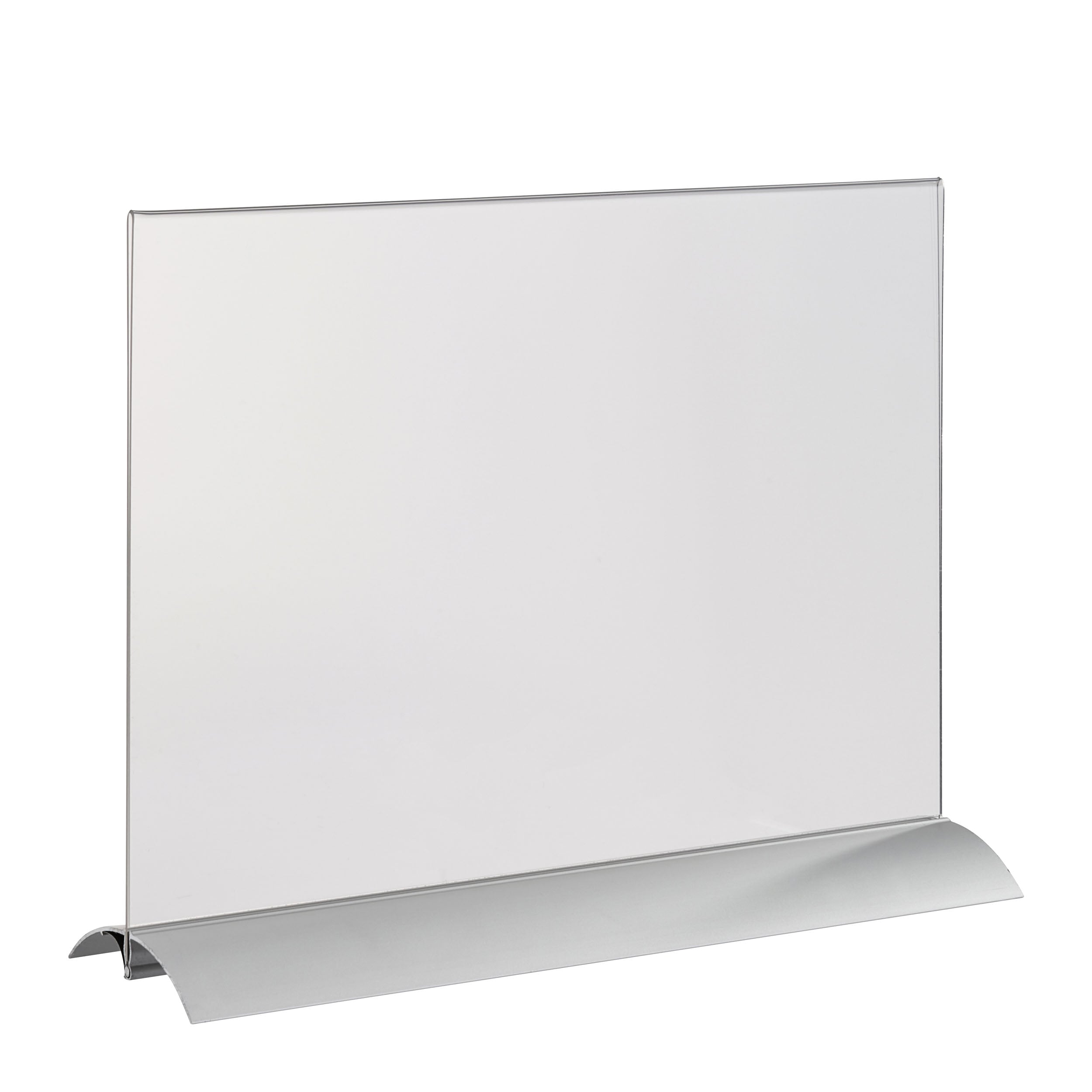 T-Aufsteller mit Aluminumklemmfuß A4 | Querformat, Acryl (PMMA)|Aluminium, silber|transparent