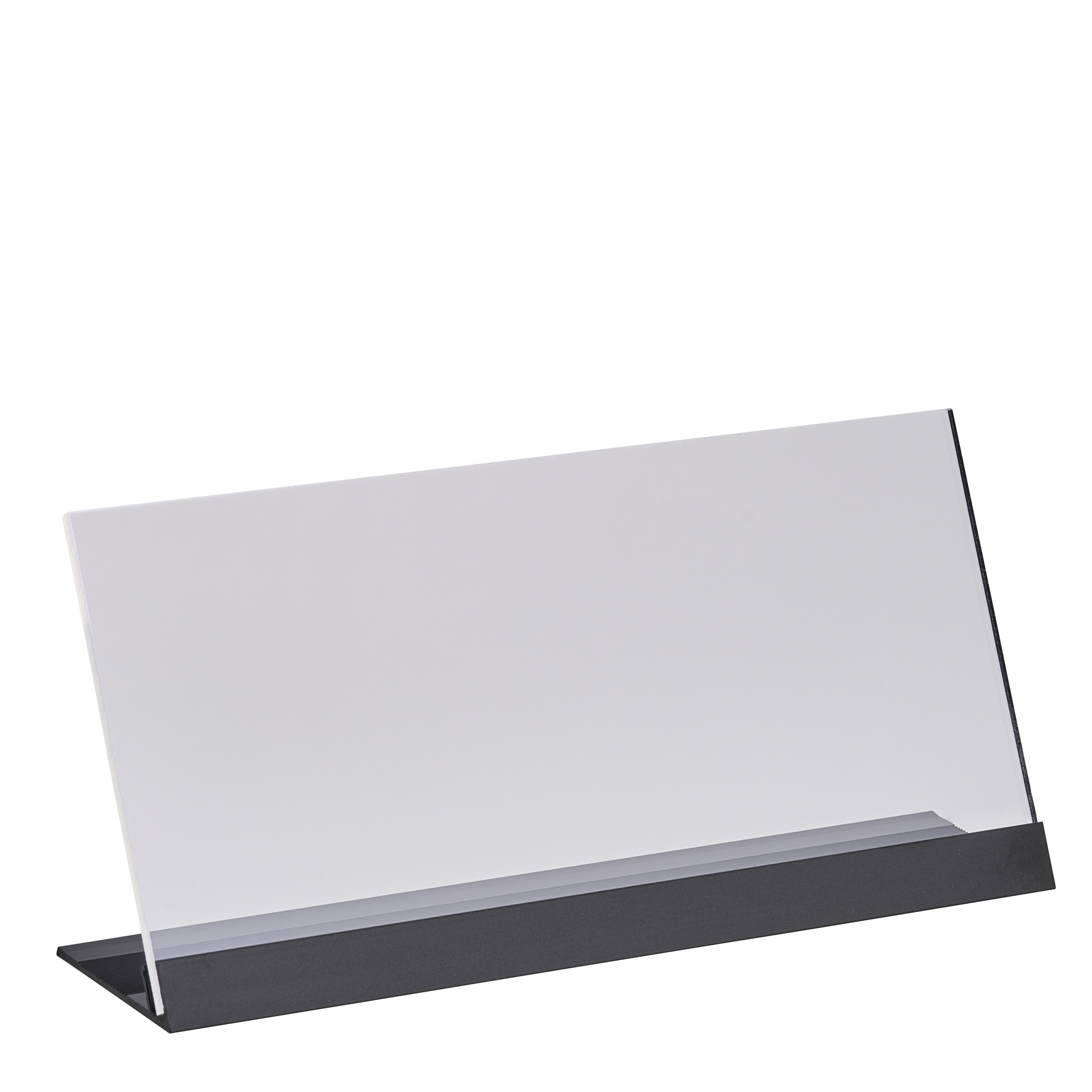 L-Aufsteller Acryl mit Aluminiumfuß 1/3 A4 (210 x 100 mm) | transparent|schwarz, Acryl (PMMA)|Aluminium