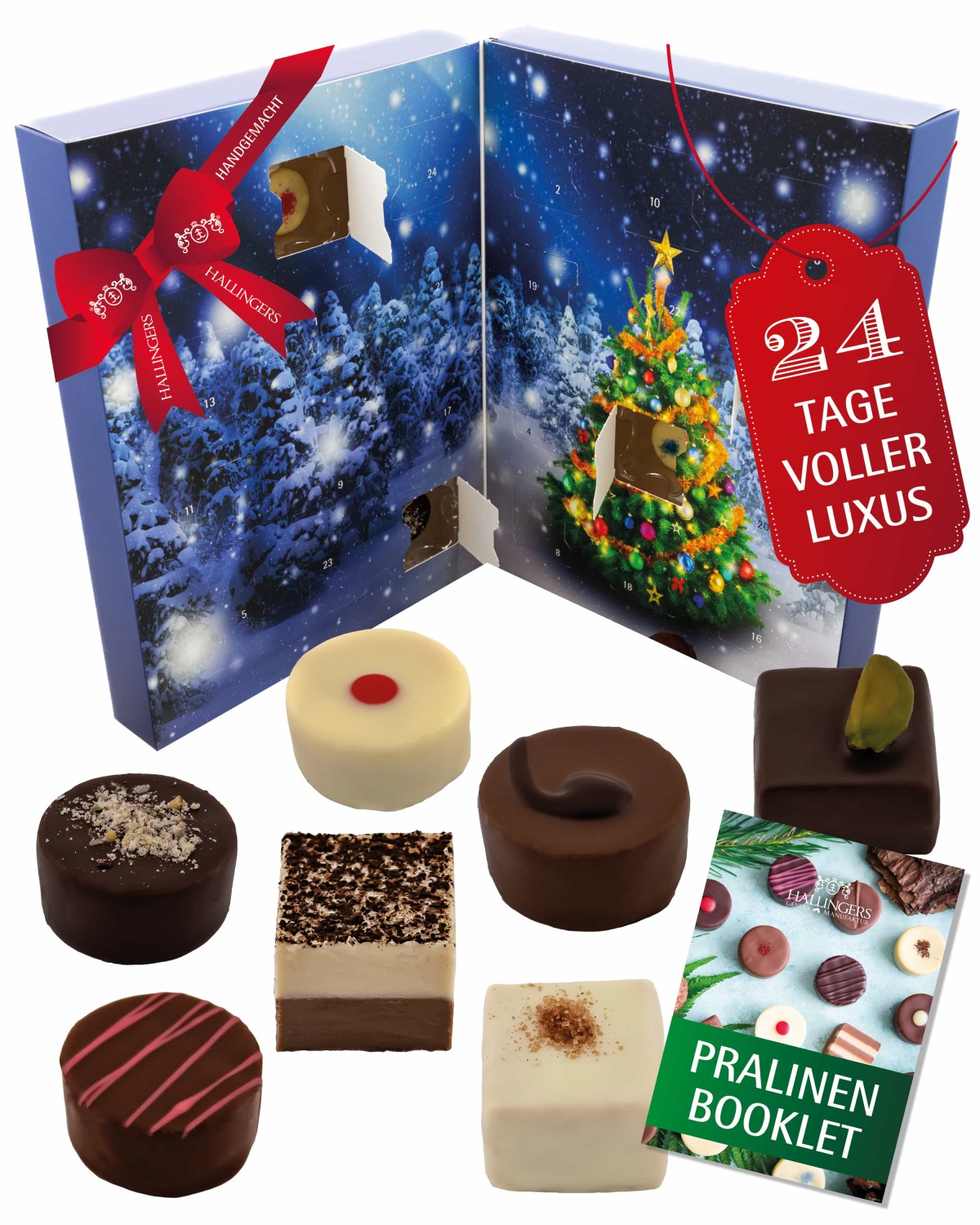 Pralinen Adventskalender ohne Alkohol – 24 handgemachte Premium Schoko Pralinen aus Edelkako - Süßigkeiten Geschenk Familie Kinder Erwachsene - Weihna