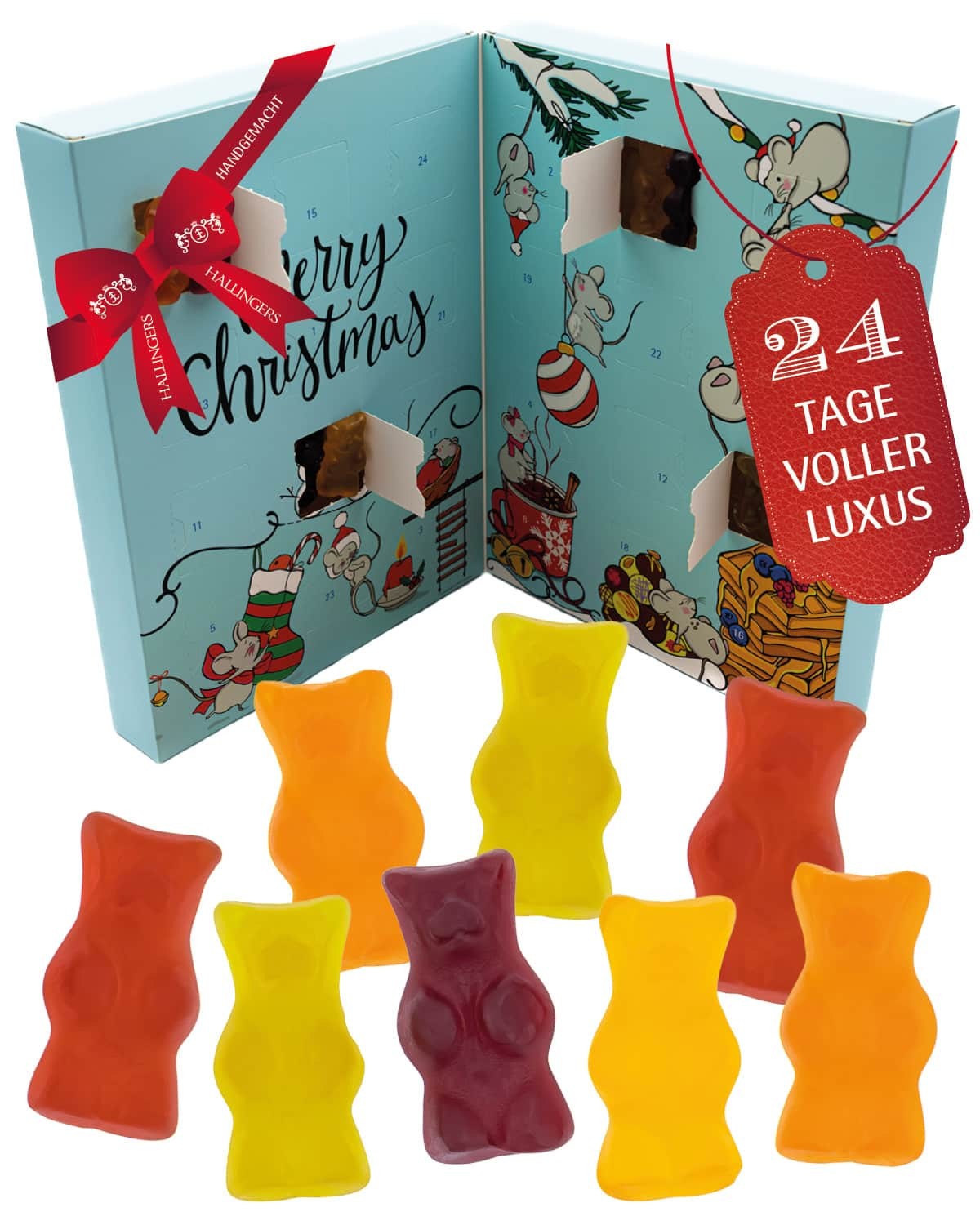 Fruchtsaftbärchen Adventskalender – 24 fruchtige Sorten, Premium Fruchtgummi Bärchen - Extra Groß, handgemacht, Süßigkeiten Geschenk Kinder Familie Er