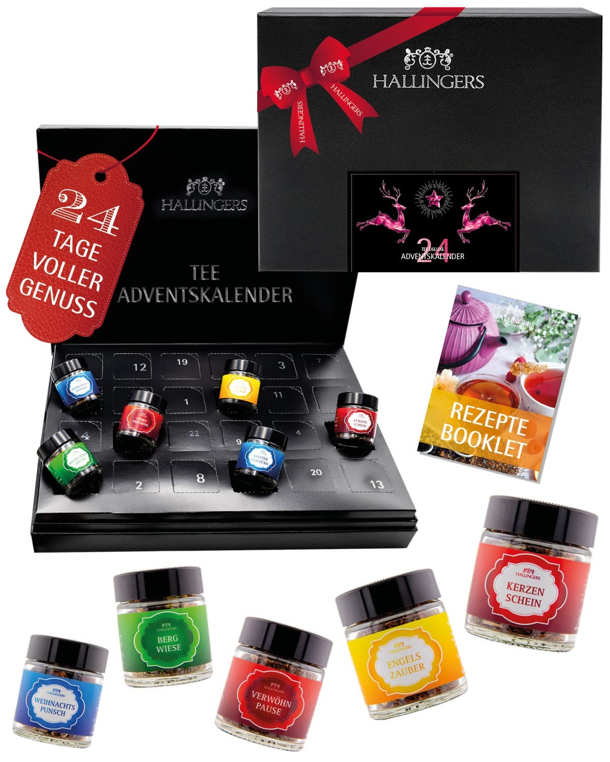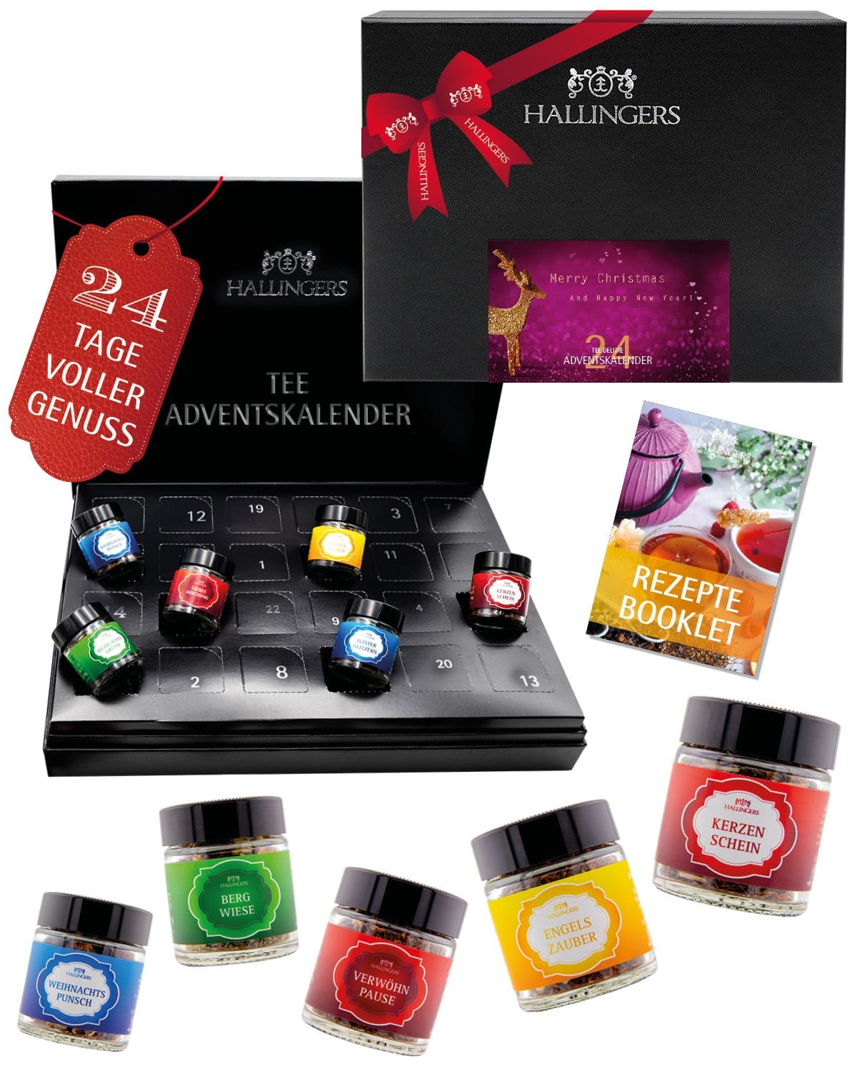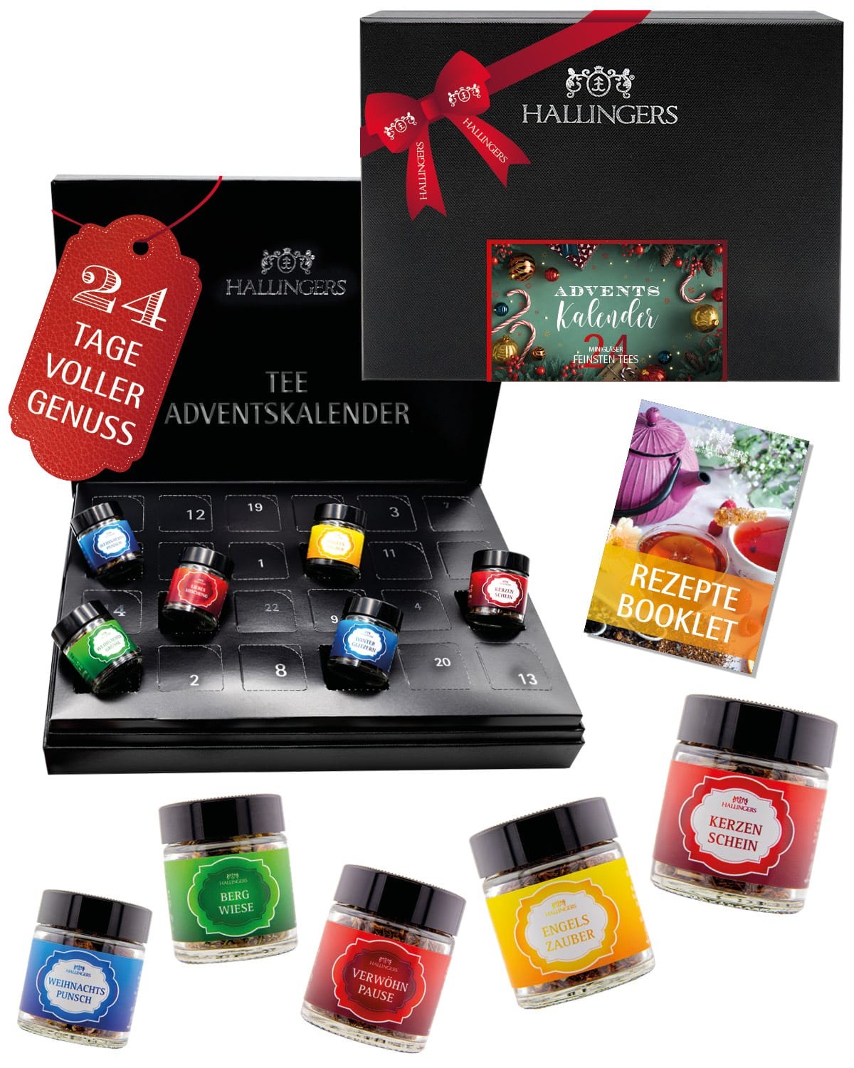 Tee Adventskalender – 24 Premium Tees mit Kochbuch, Kräutertee Früchtetee Schwarztee Grüntee, Tee Geschenk für Frauen Männer Teeliebhaber, Weihnachtsk