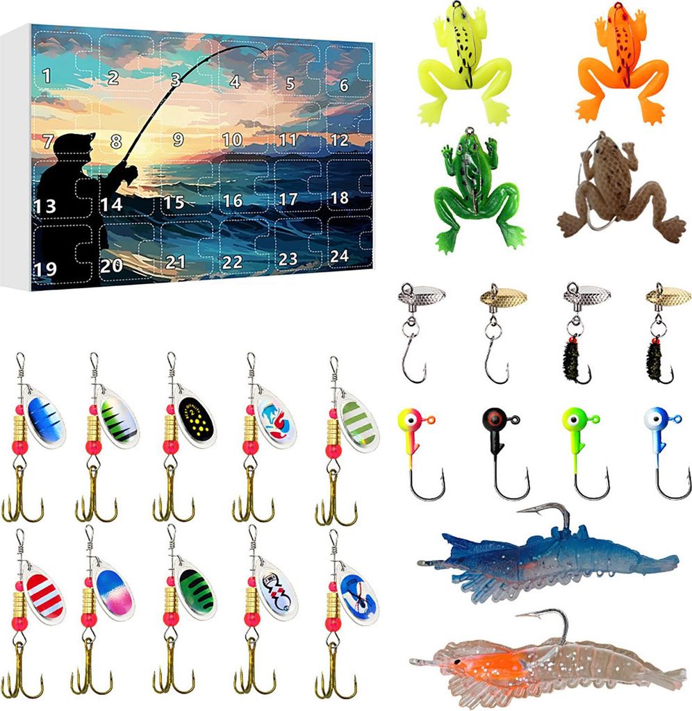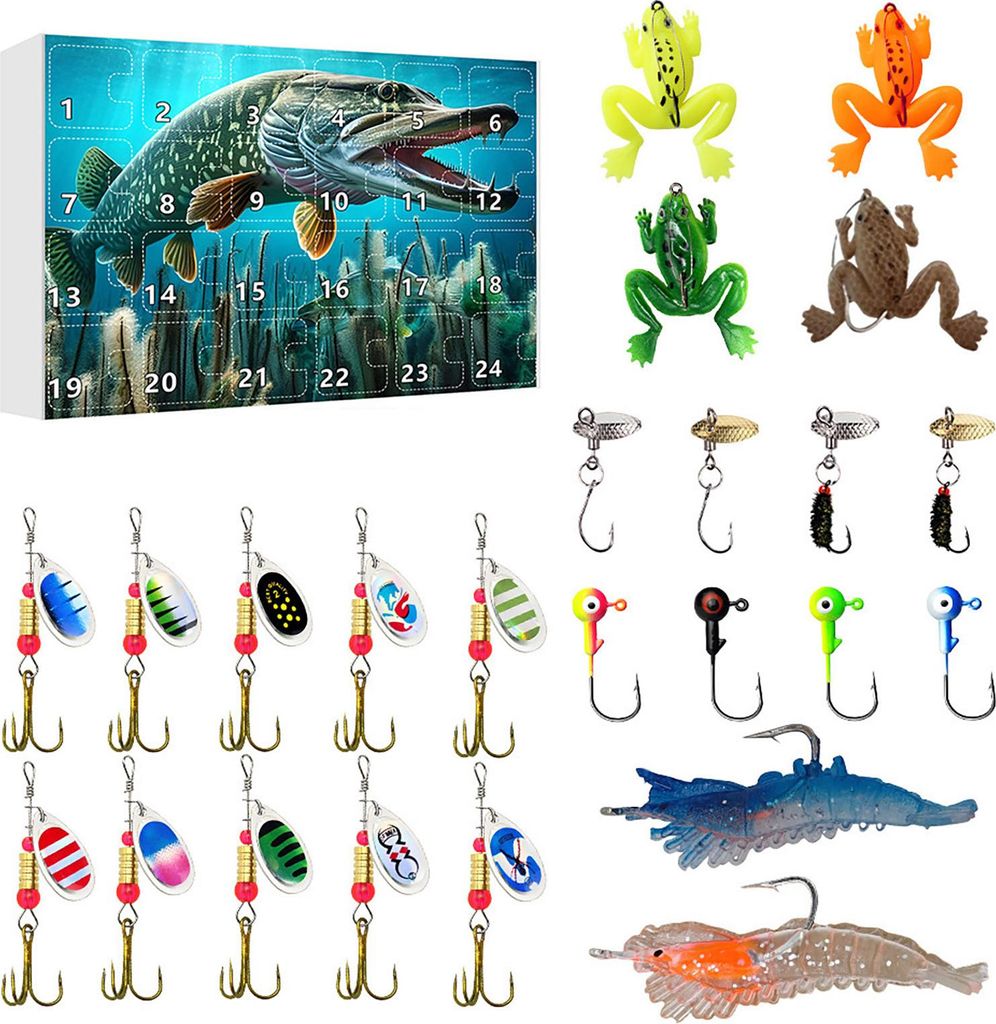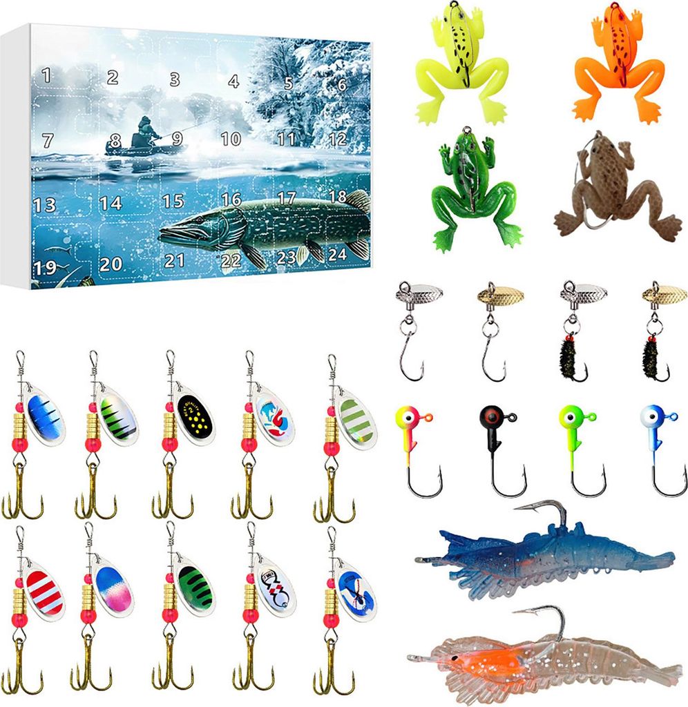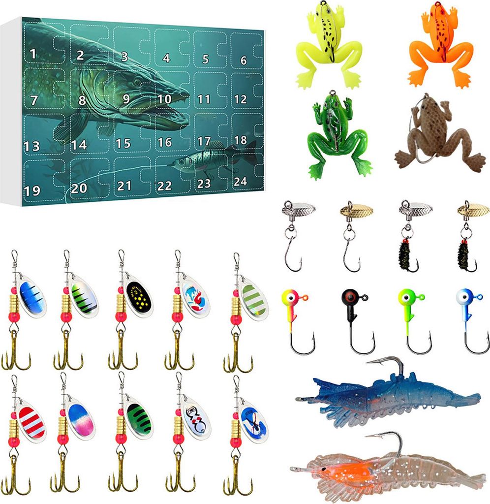 Angel-Adventskalender, 24 Tage, Weihnachts-Countdown-Kalender mit Angelköder-Set für Erwachsene, Männer, Teenager und Jungen