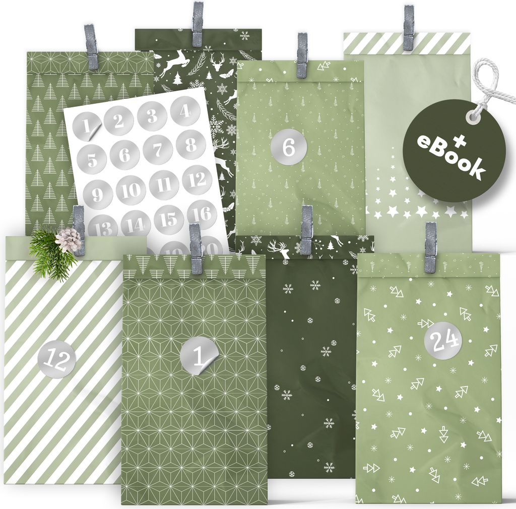 AMARI Adventskalender zum Befüllen No.5 Midnight Green - 24 Papier Adventstüten (mit Holzklammern) zum Basteln für Weihnachten