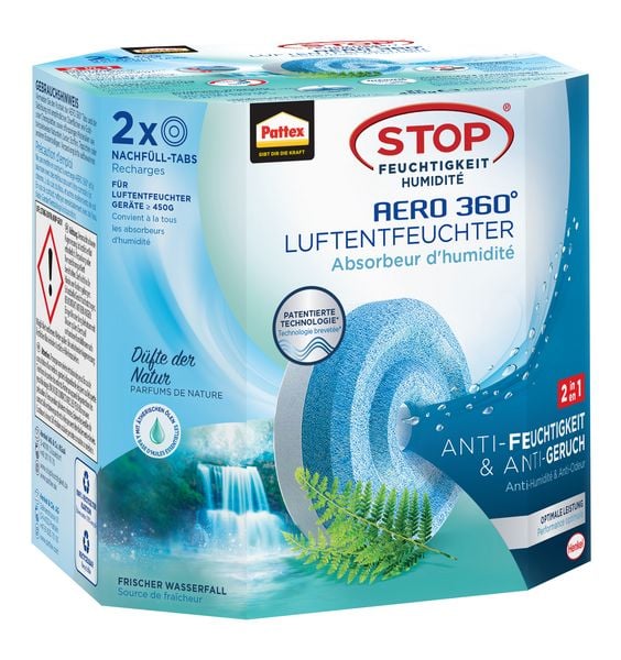 Pattex Luftentfeuchter Aero 360° Nachfülltabs Frischer Wasserfall, Faltschachtel, 1x2 Stück