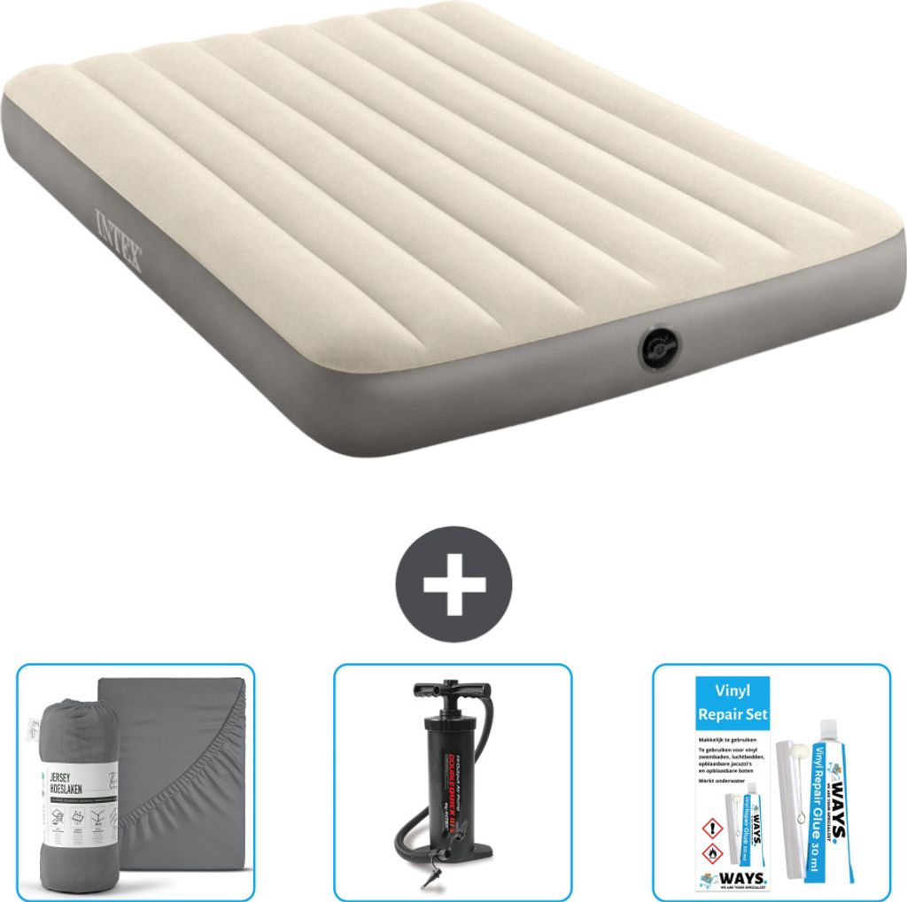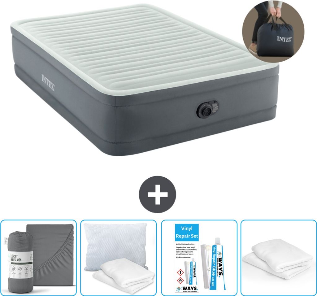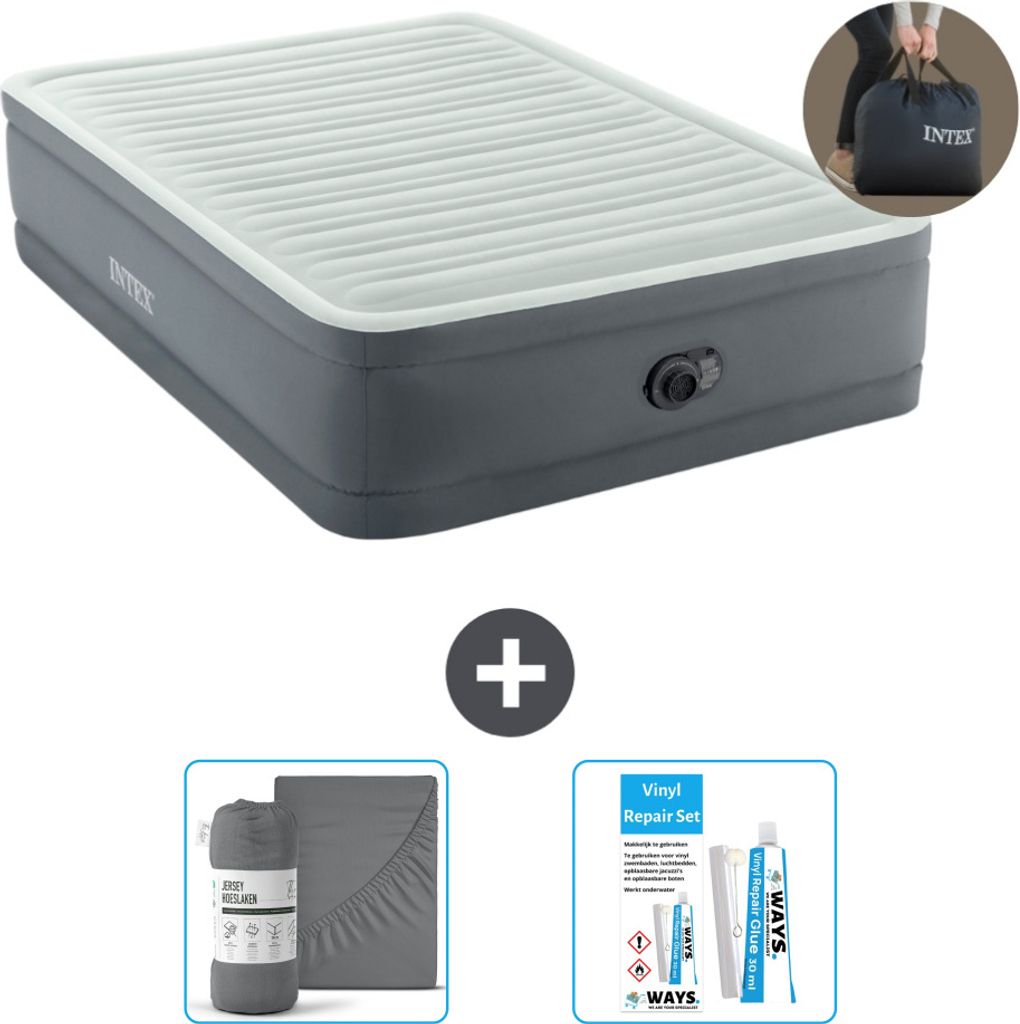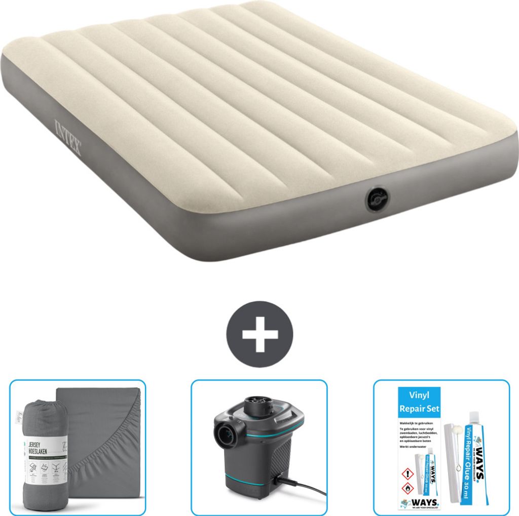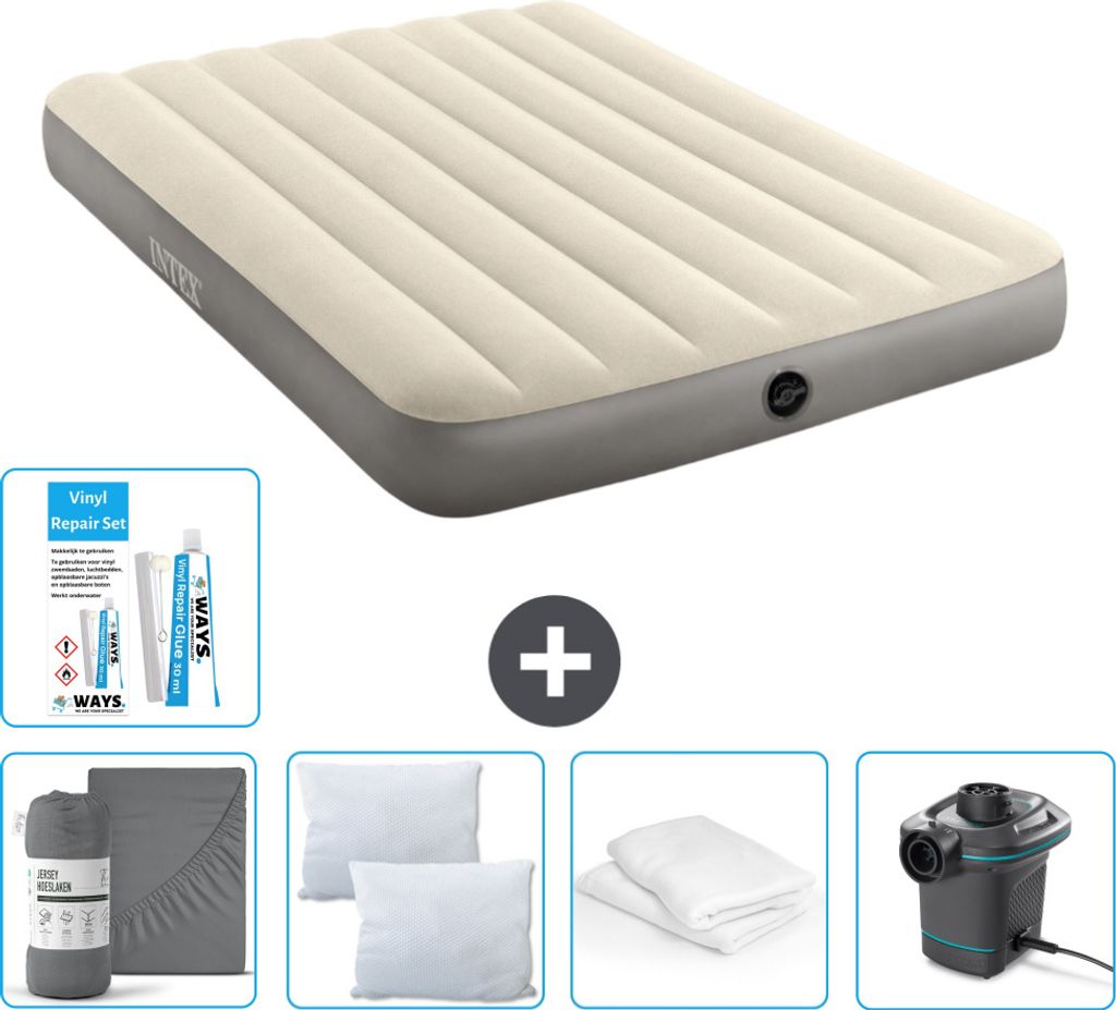 Intex Airbed - Doppelbett - 137 x 191 x 46 cm - Grau - Inklusive Pumpe - Spannbettuch - Küssen - Reperaturset en Kissenschutz