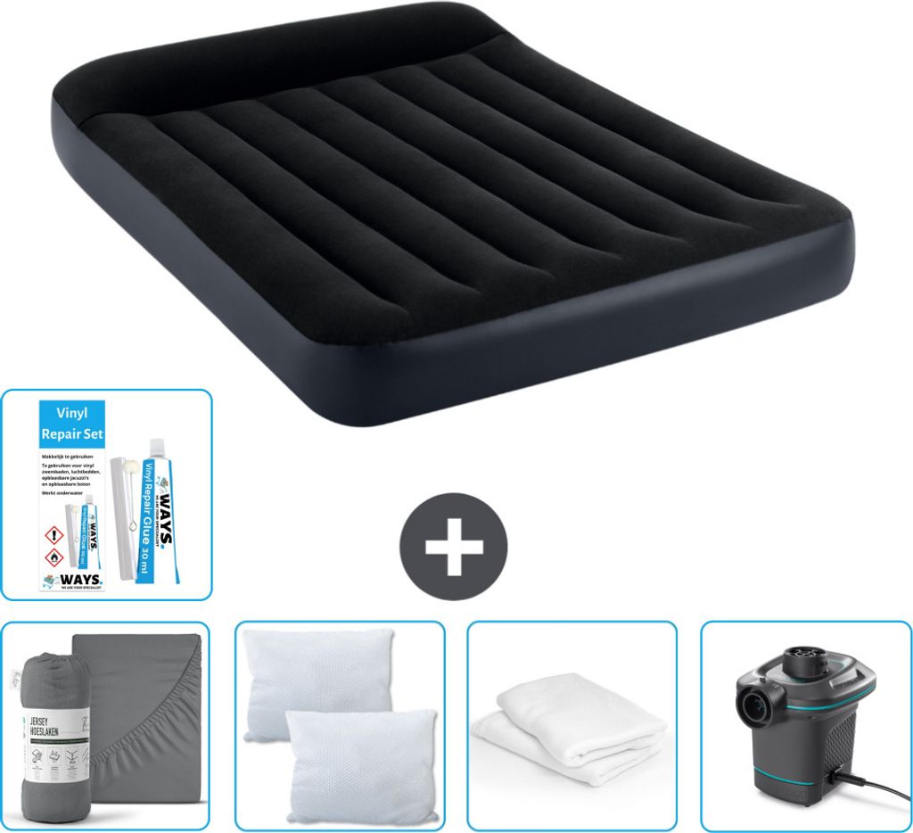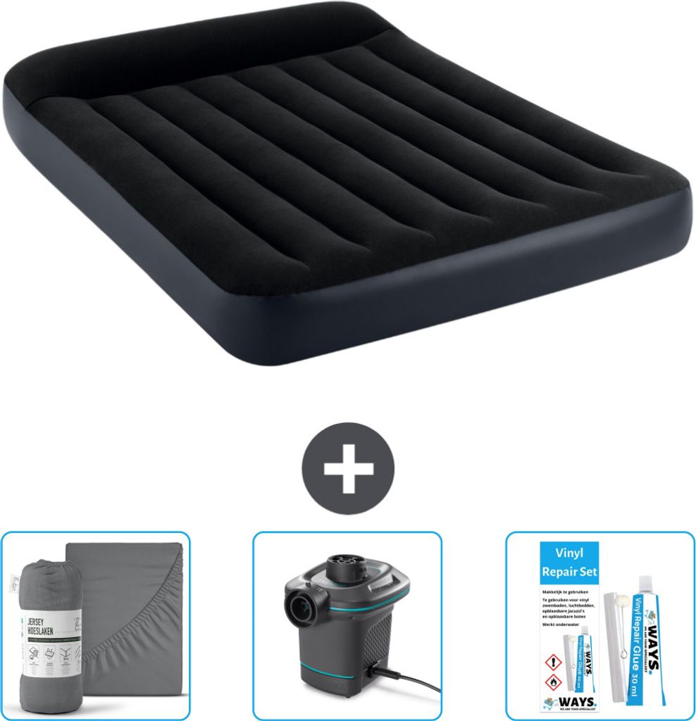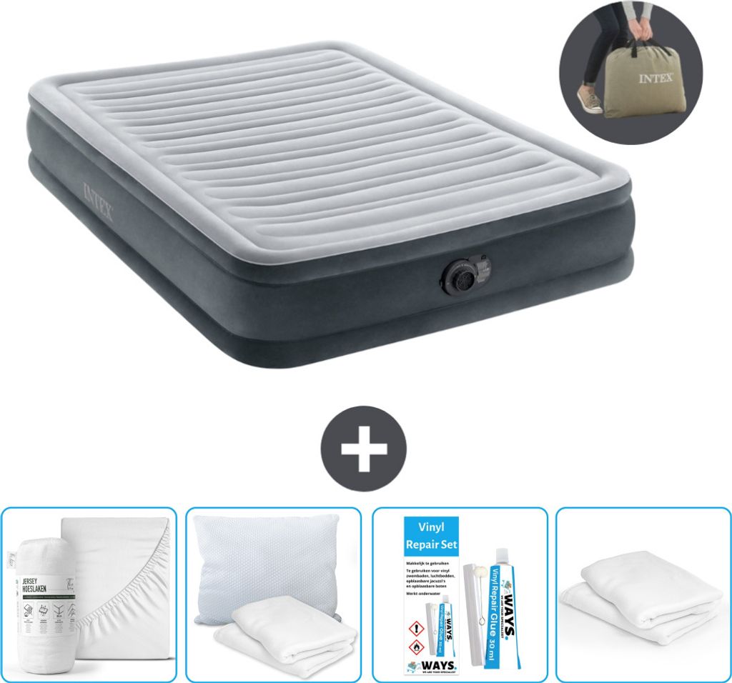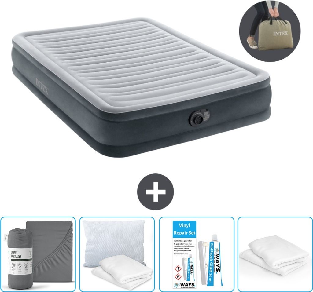 Intex Airbed - Doppelbett - 137 x 191 x 46 cm - Grau - Inklusive Pumpe - Spannbettuch - Küssen - Reperaturset en Kissenschutz