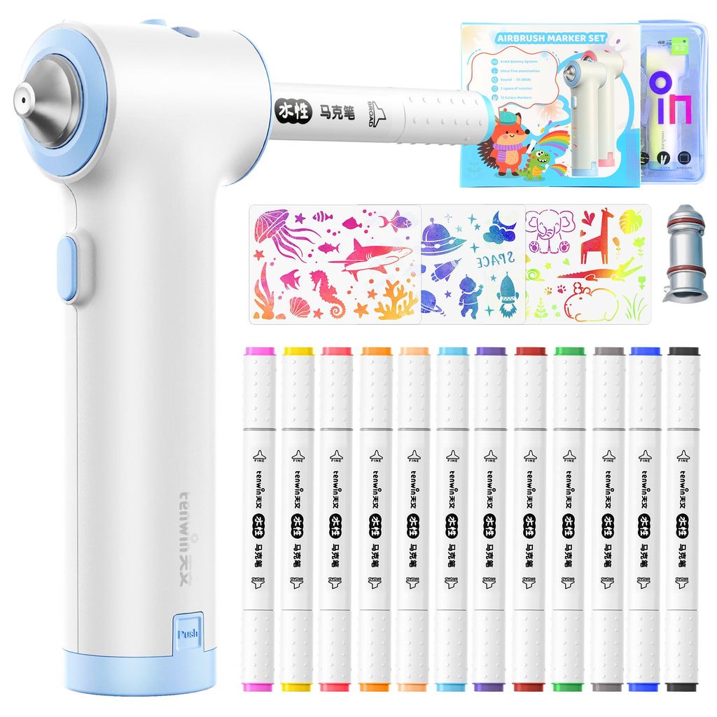 Elektrisches Airbrush Marker Set für Kinder – Batteriebetriebenes Kunst-Malset mit 12 doppelspitzigen Filzstiften, 3 Schablonen und 1 Aufbewahru...
