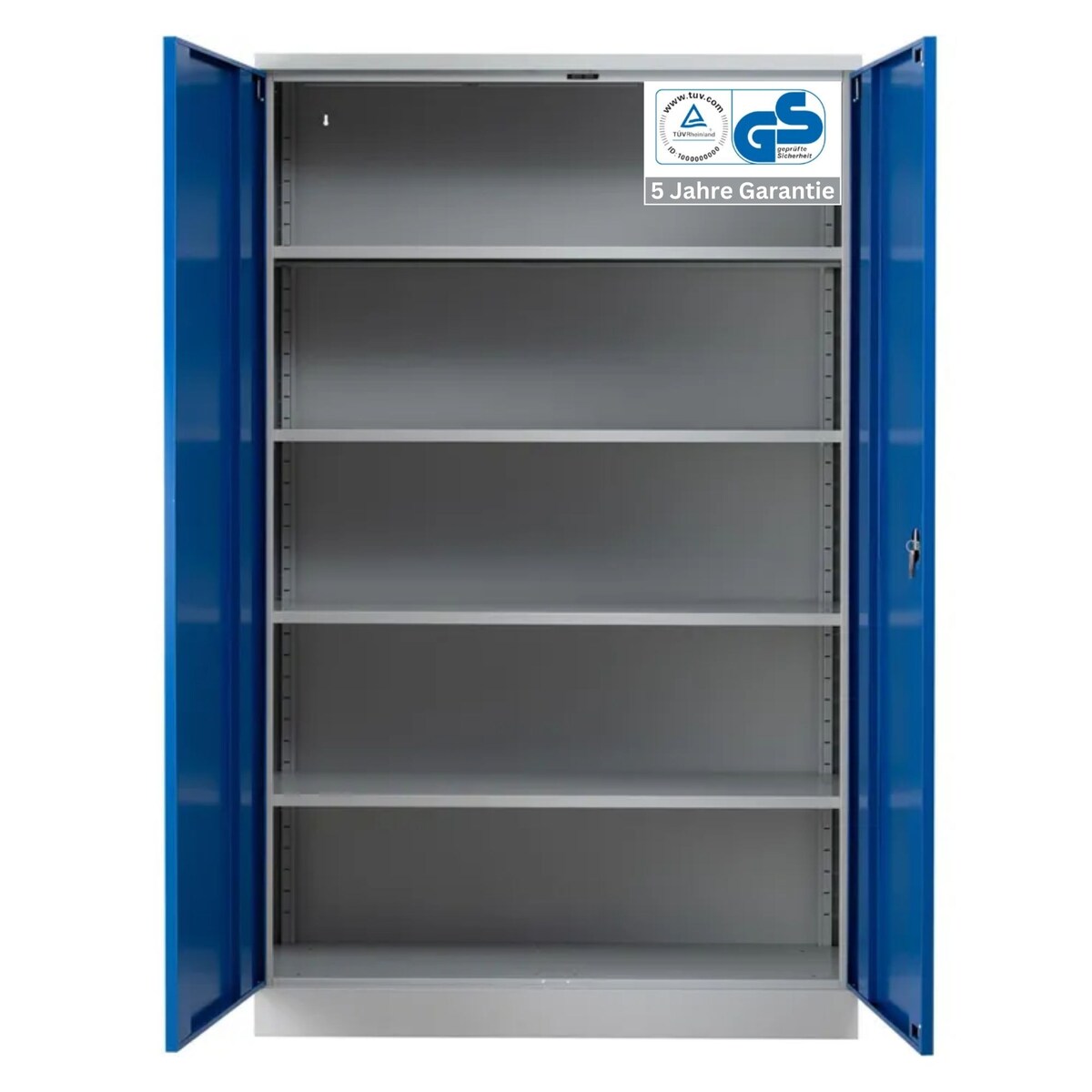 PROREGAL Stahlschrank BEE mit 6 verzinkten Fachböden | HxBxT 195x120x42cm | Grau-Blau | Werkstattschrank Werkzeugschrank Aktenschrank Universalschrank