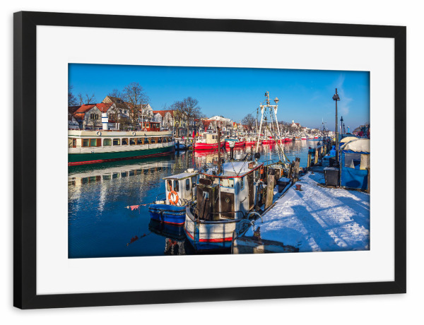 Poster mit Rahmen schwarz "Boote, Schnee und Alter Strom" artboxONE - Natur,Reise,Architektur,Reise / Strand und Meer