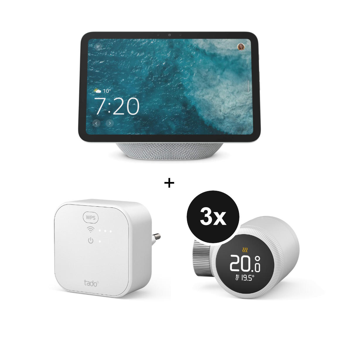 Amazon Echo Show 8 - Neueste Generation + tado° X Starter Kit Smartes Heizkörper-Thermostat - 3er-Set & Bridge