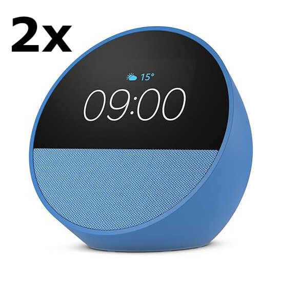 Bundle 2x Amazon Echo Spot 2024, blau Smart Clock, Erinnerungen, Wetter, Timer und mehr. Lass dir Songtitel anzeigen und steuere einfach per Sprachb