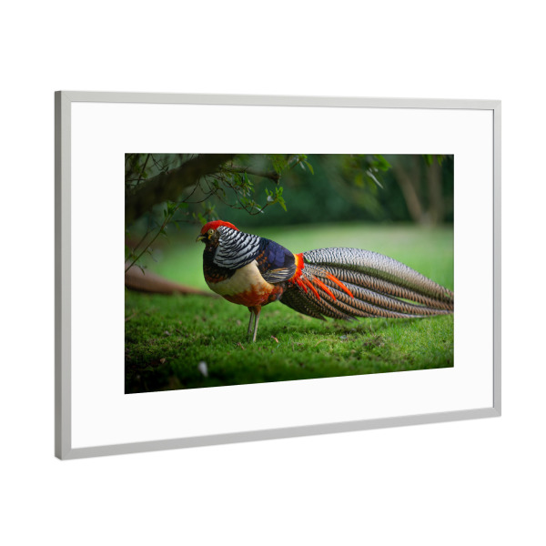 Poster mit Rahmen Silber "Fabulous Feathers" artboxONE - Natur,Tiere - Vogelportrait,Fasan,Bunt,Garten,Rasen,Gras,Tier,Animal,Bird,Vogel