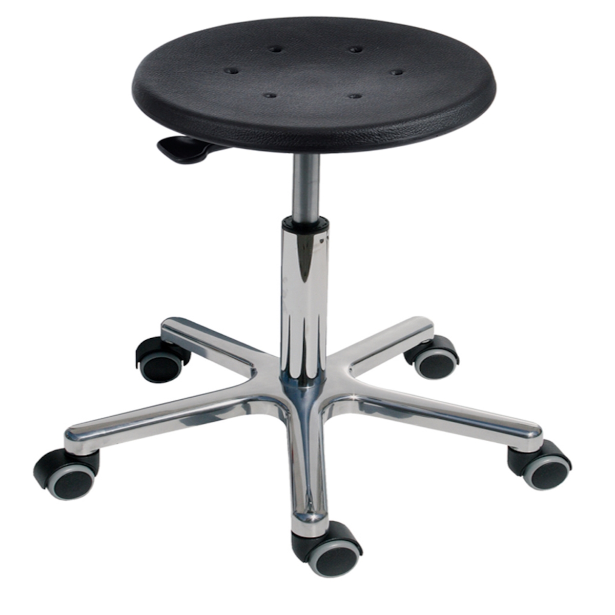 PROREGAL Antistatischer Drehhocker Indianapolis, ESD-Sitz, Sitzhöhe 44-62cm, Tragfähigkeit 110kg, Polyurethane-Sitz, Aluminium-Fußkreuz, Rollen
